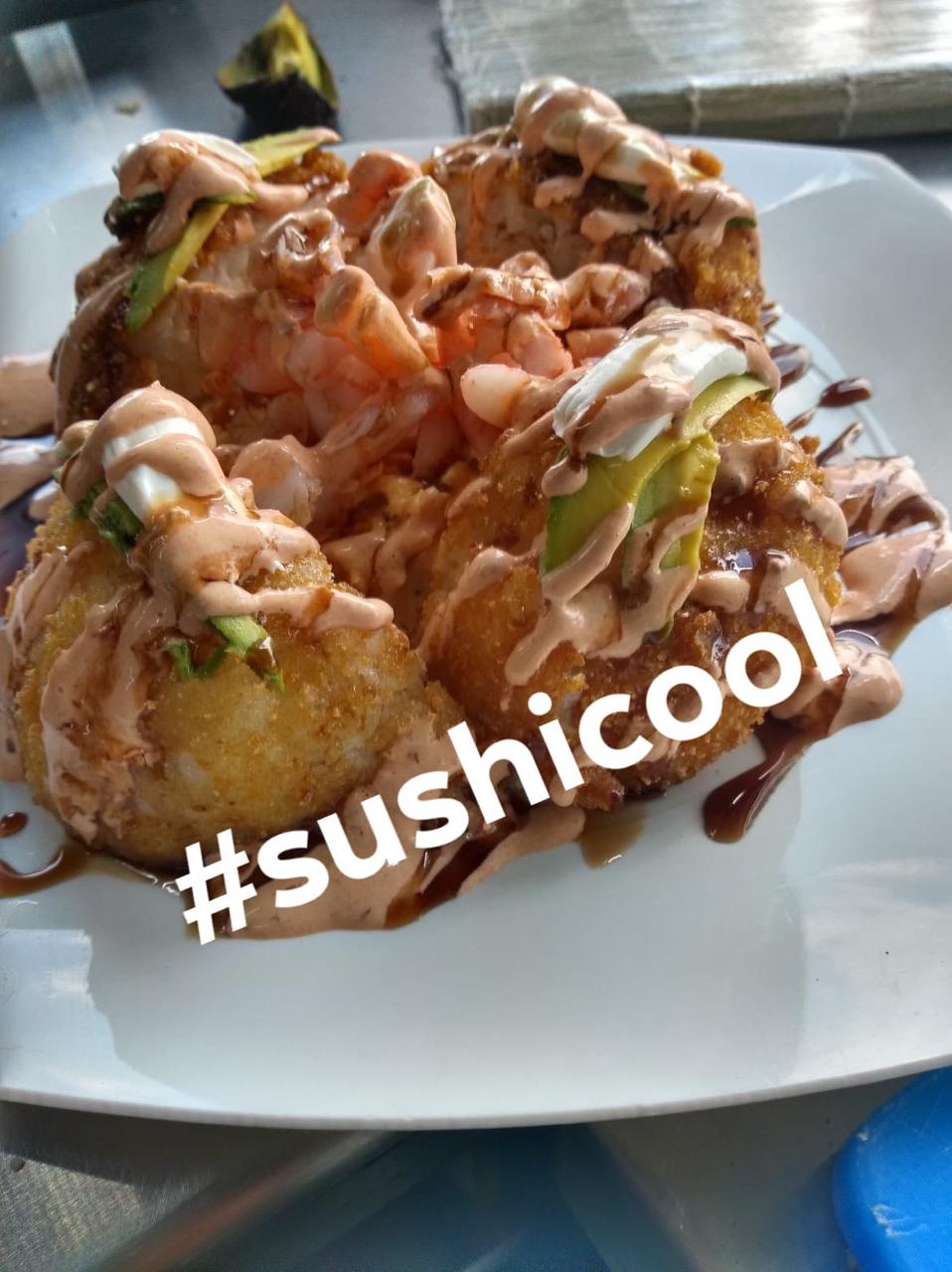 Bola de arroz empanizada con philadelphia, aguacate, ensalada de surimi, salsa de anguila y chipotle.