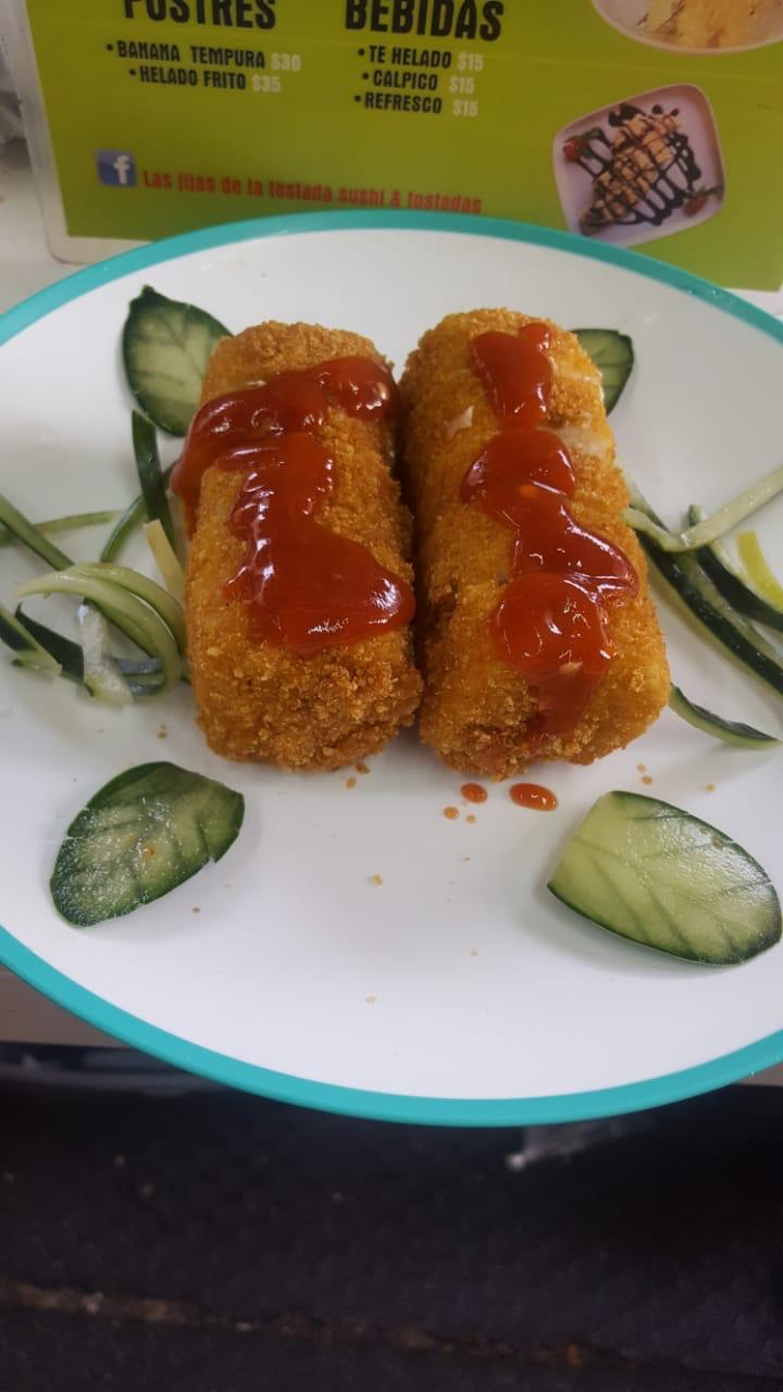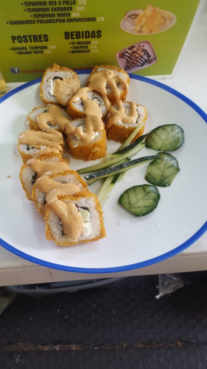 Philadelphia, pepino, zanahoria, camarón, por fuera empanizado y bañado en aderezo chipotle.