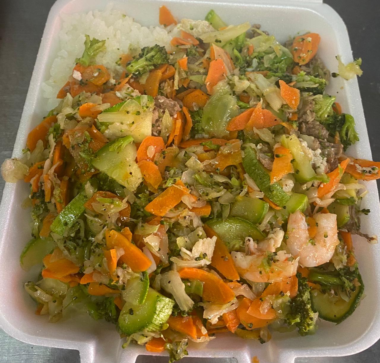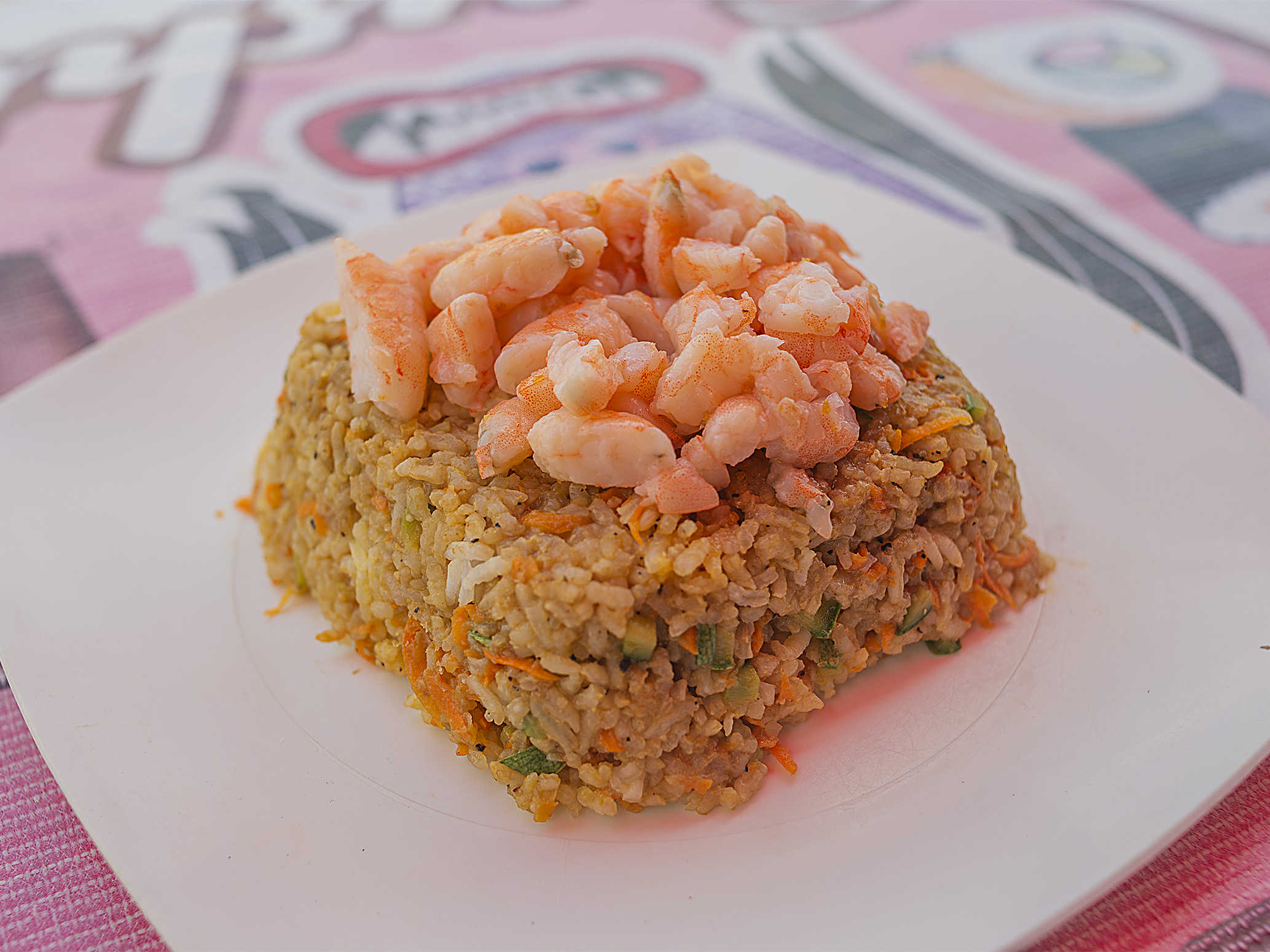 Arroz frito, sazonado con calabaza y zanahoria, acompañado de res, pollo y camarón.