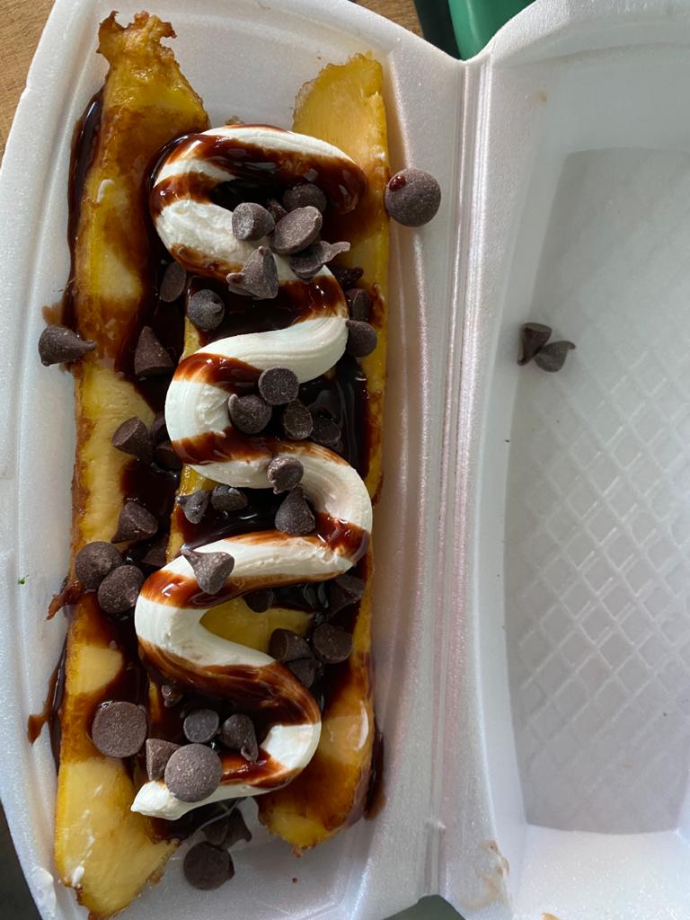 Platano macho, relleno de philadelphia, bañado en tempura dulce y frito