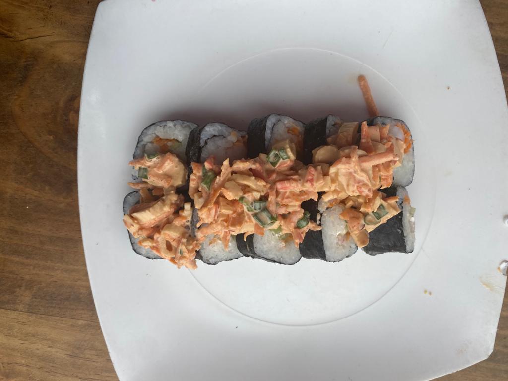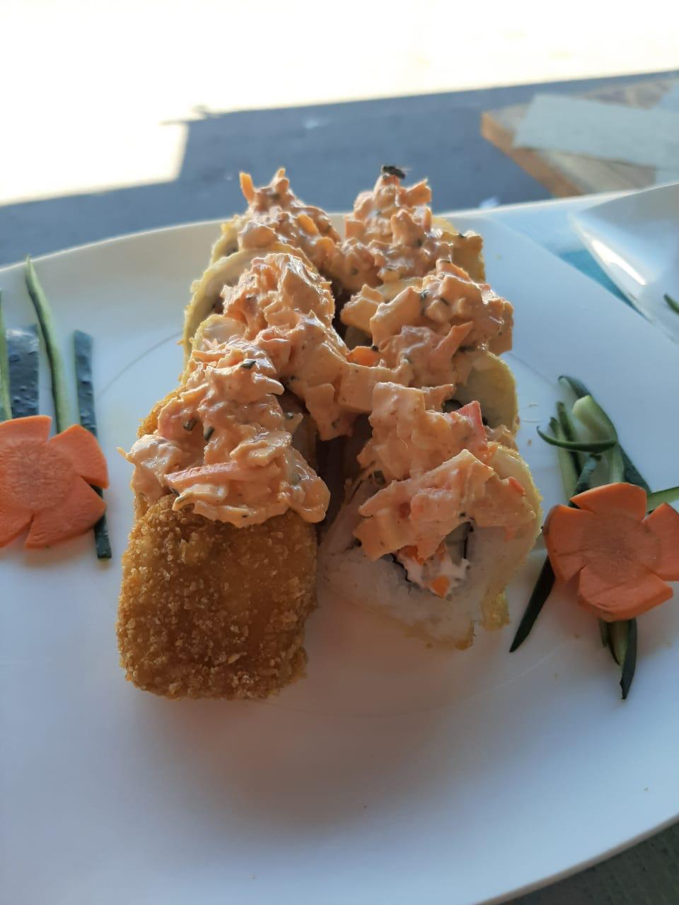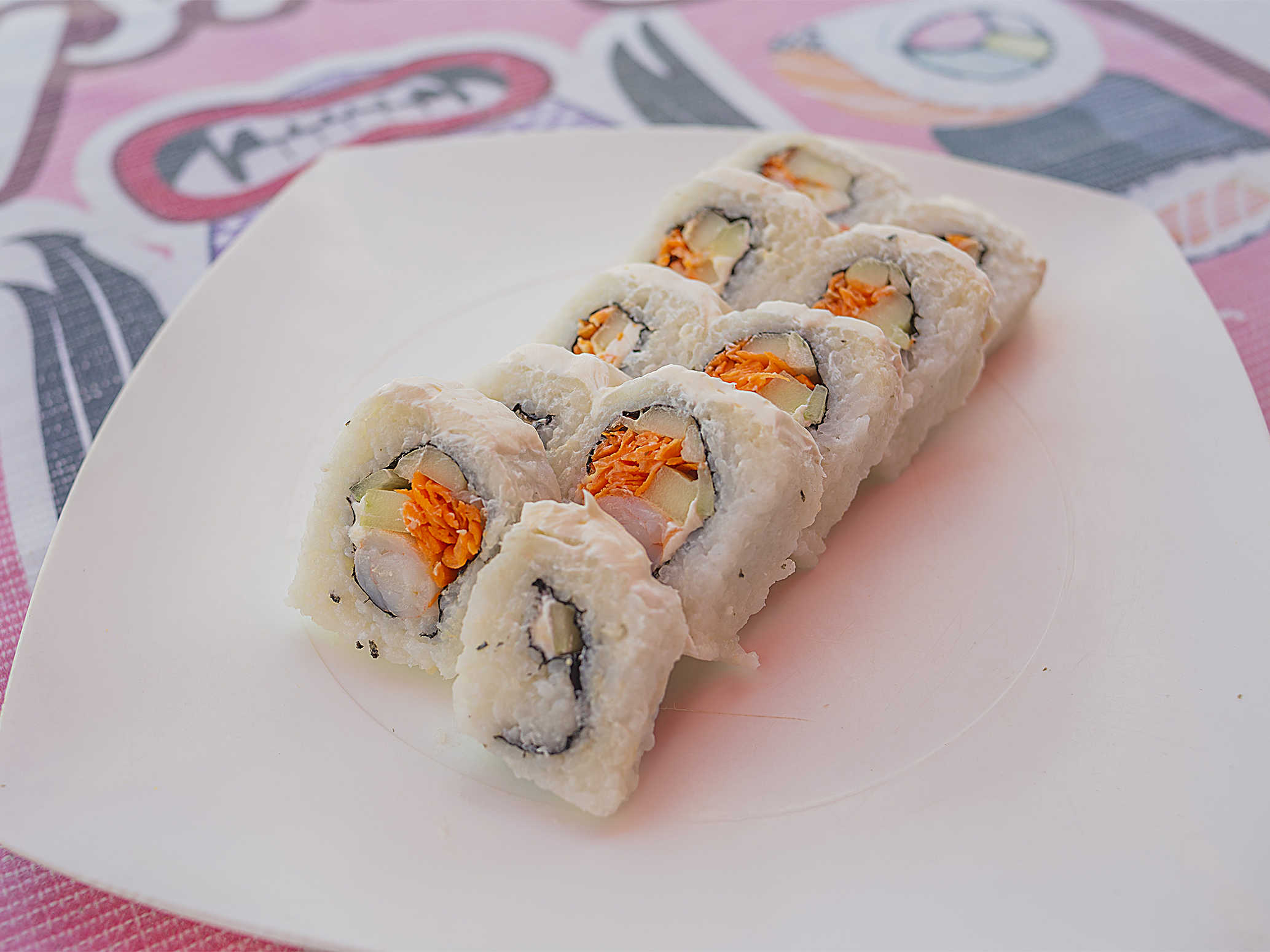 Rollo de sushi empanizado (8 a 10 piezas), con un relleno fresco de camarón, queso crema Philadelphia, pepino y zanahoria. Finalizado con una generosa porción de ensalada Kani especial de la casa. Plato personal