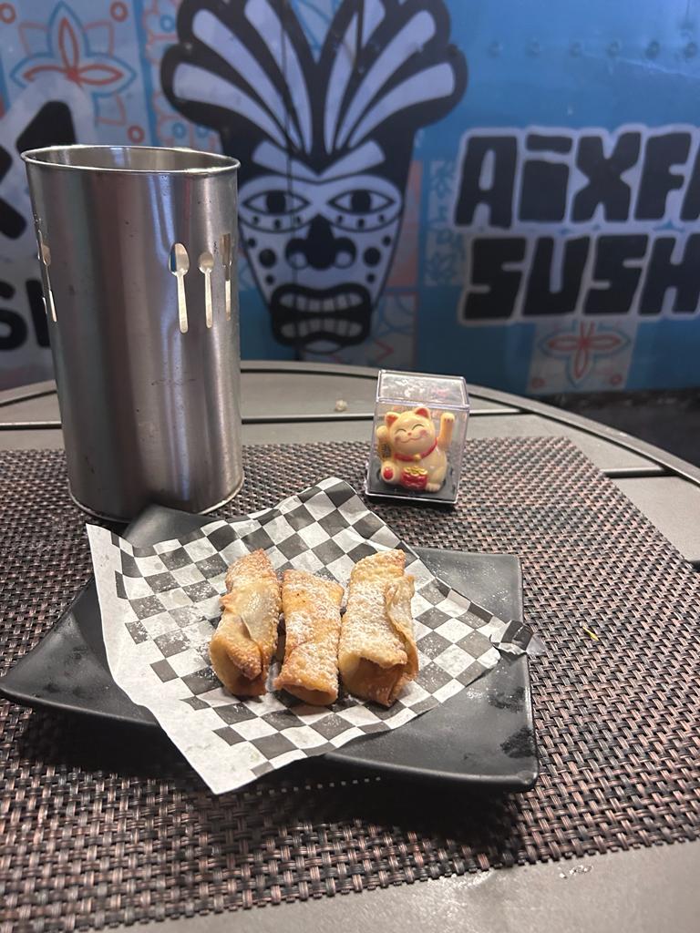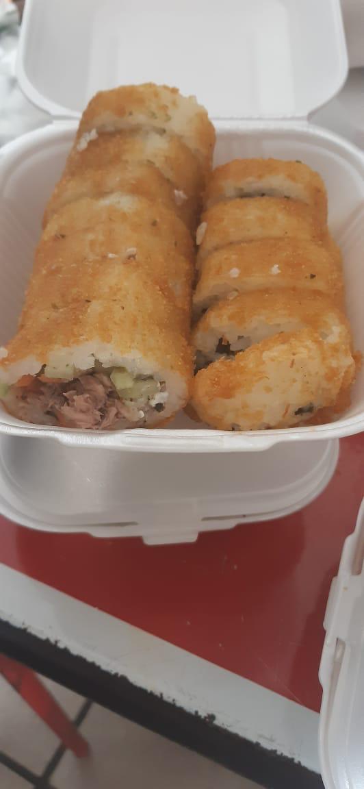 Por dentro Philadelphia, pepino, zanahoria, camarón, por fuera philadelphia y plátano macho frito.