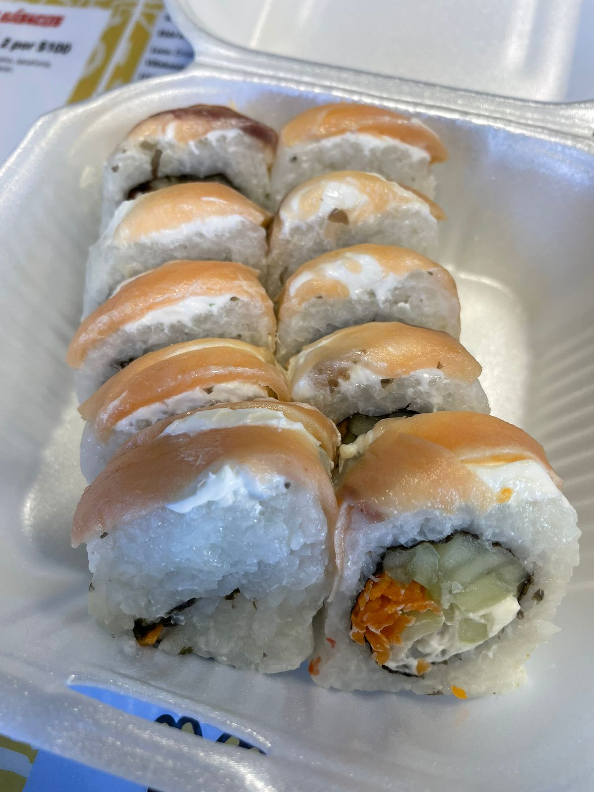 Aproximadamente 8 piezas, incluye philadelphia, pepino, zanahoria, camarón y alga por fuera. (Porción personal).