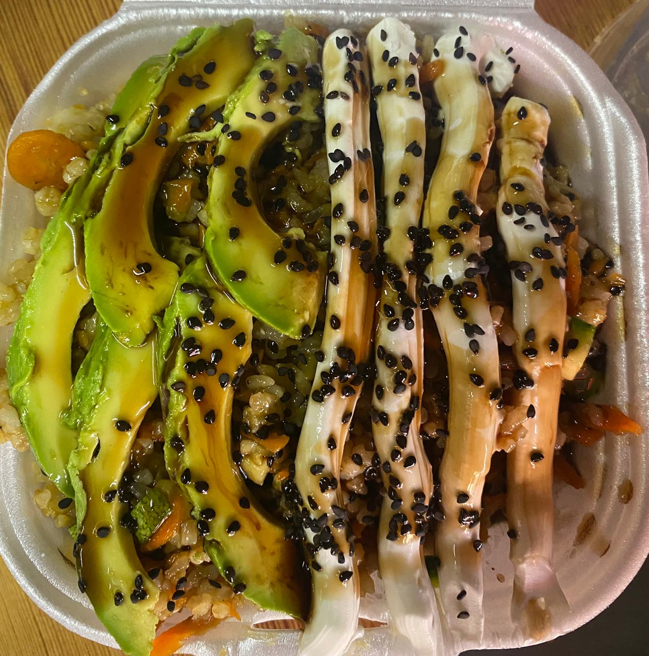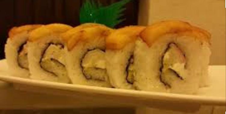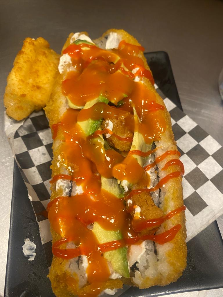 Por dentro Philadelphia, pepino, zanahoria, camarón, por fuera empanizado coronado ,Ensalada de surimi, aguacate, salsa de anguila, siracha.