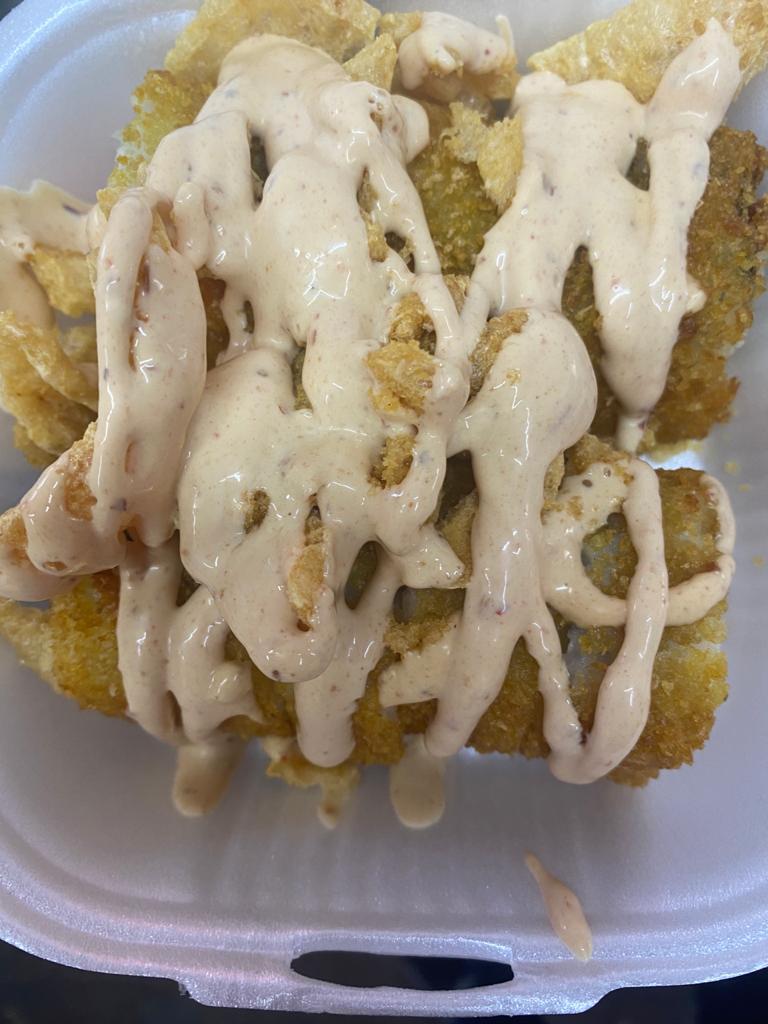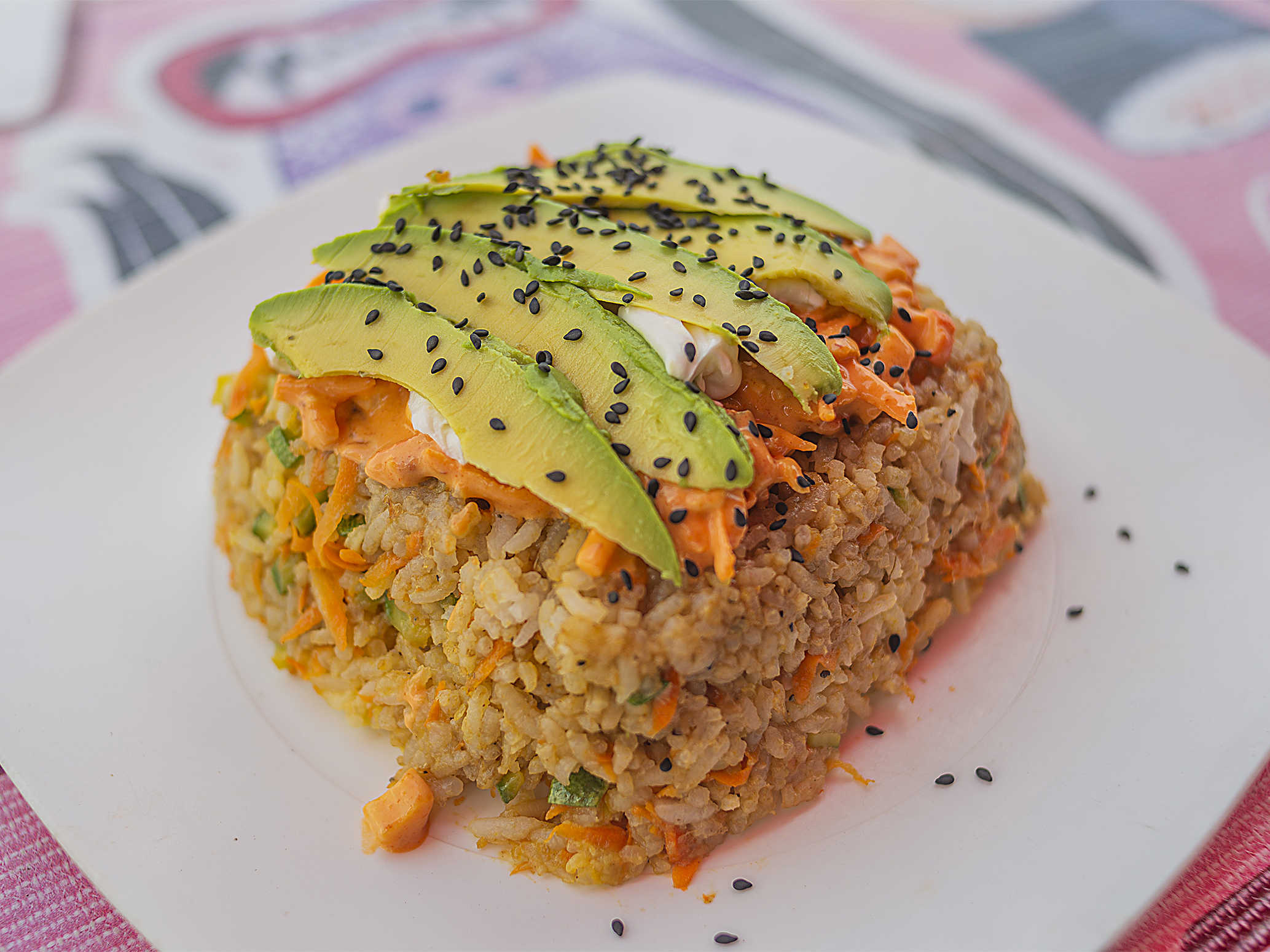 Arroz frito con camarones empanizados y aderezo de chipotle. Plato personal