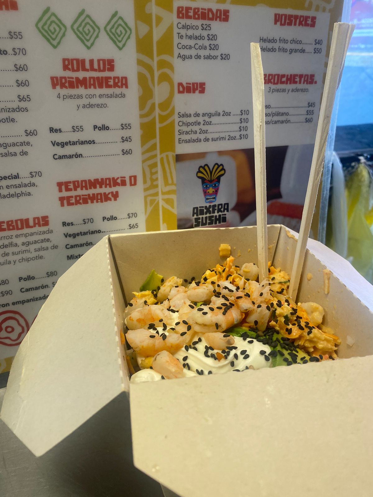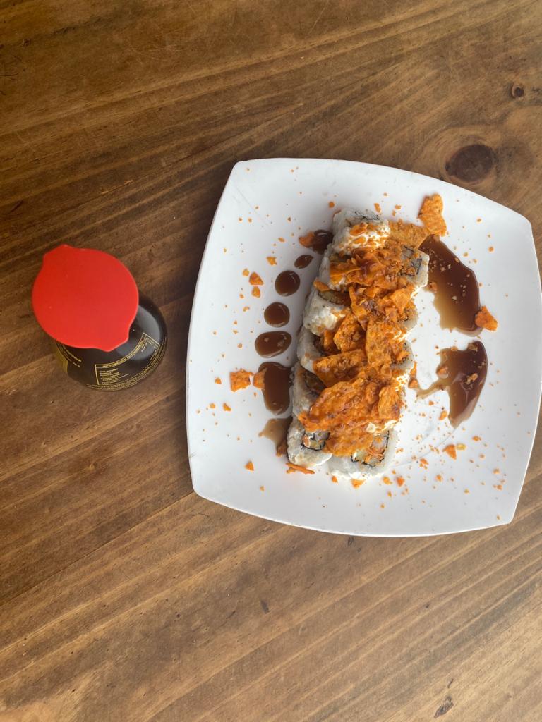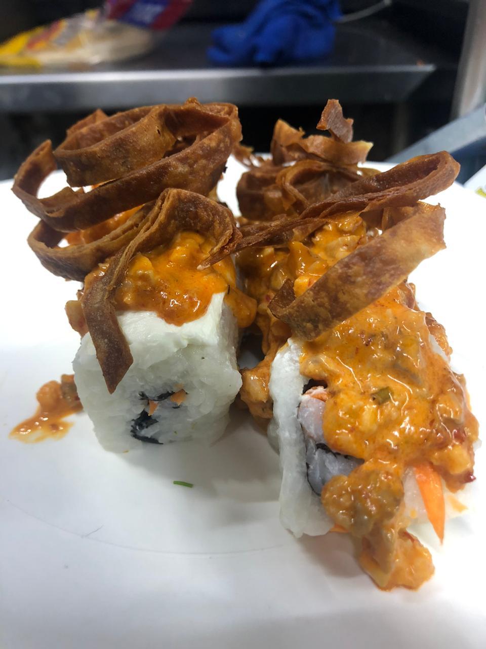 Delicioso sushi Philadelphia bañado en una salsa cremosa de chipotle acompañada de res pollo y camarón coronado con tortilla frita