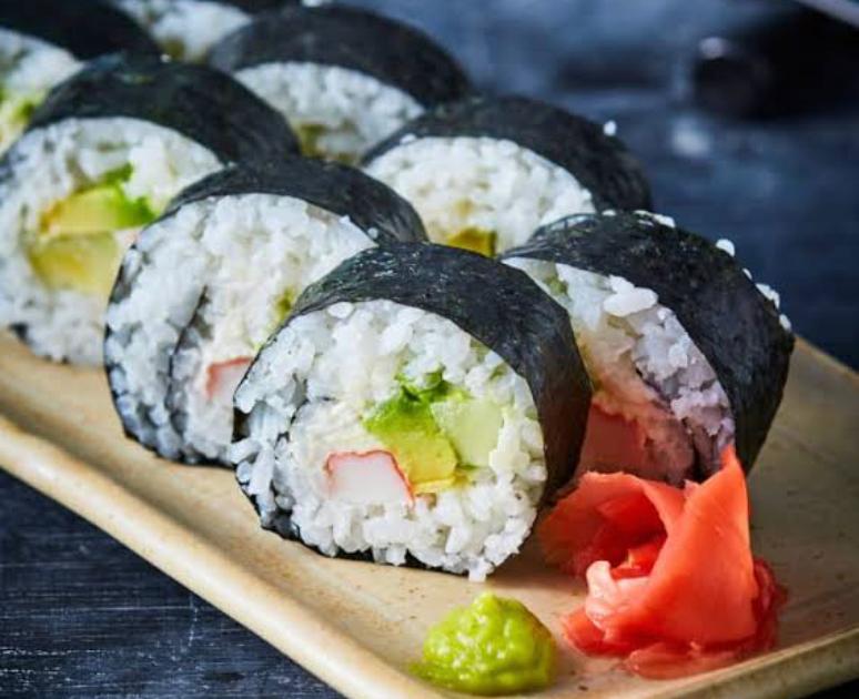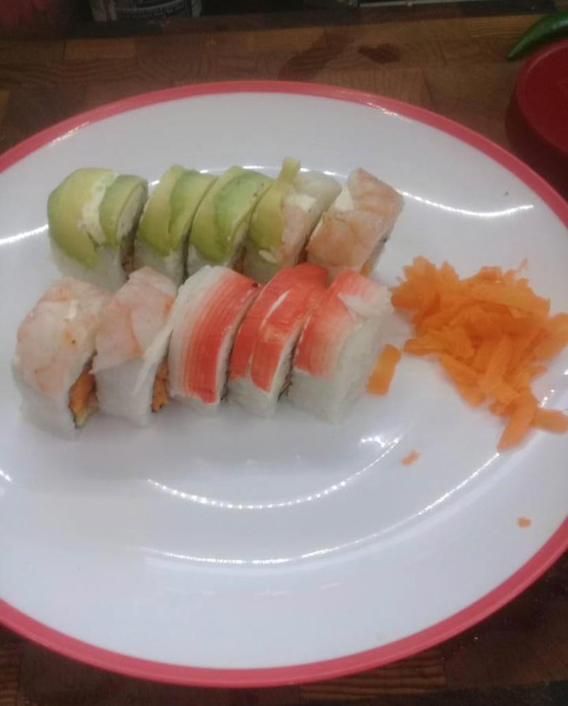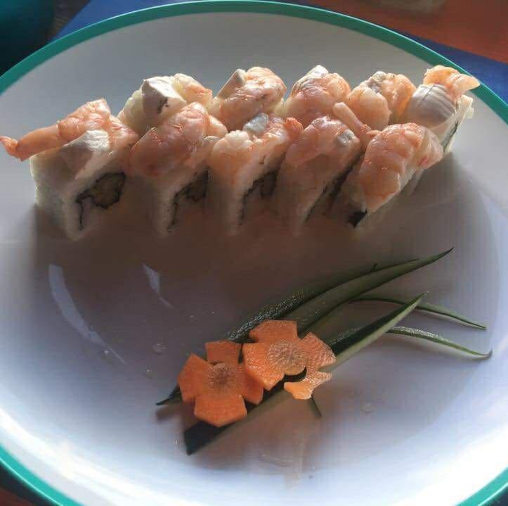 Sushi (8 a 10 bocados): Rollo relleno de queso crema Philadelphia, pepino, zanahoria y camarón. Plato personal