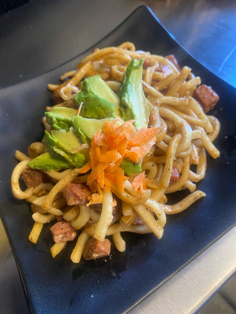 Deliciosa pasta de udon condimentada, salteada con mantequilla y un toque de anguila.