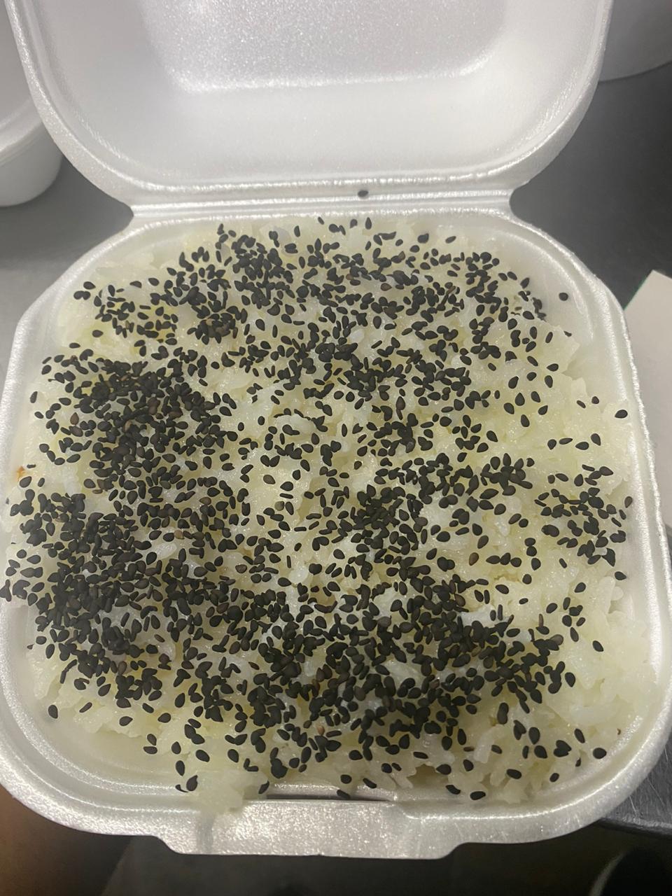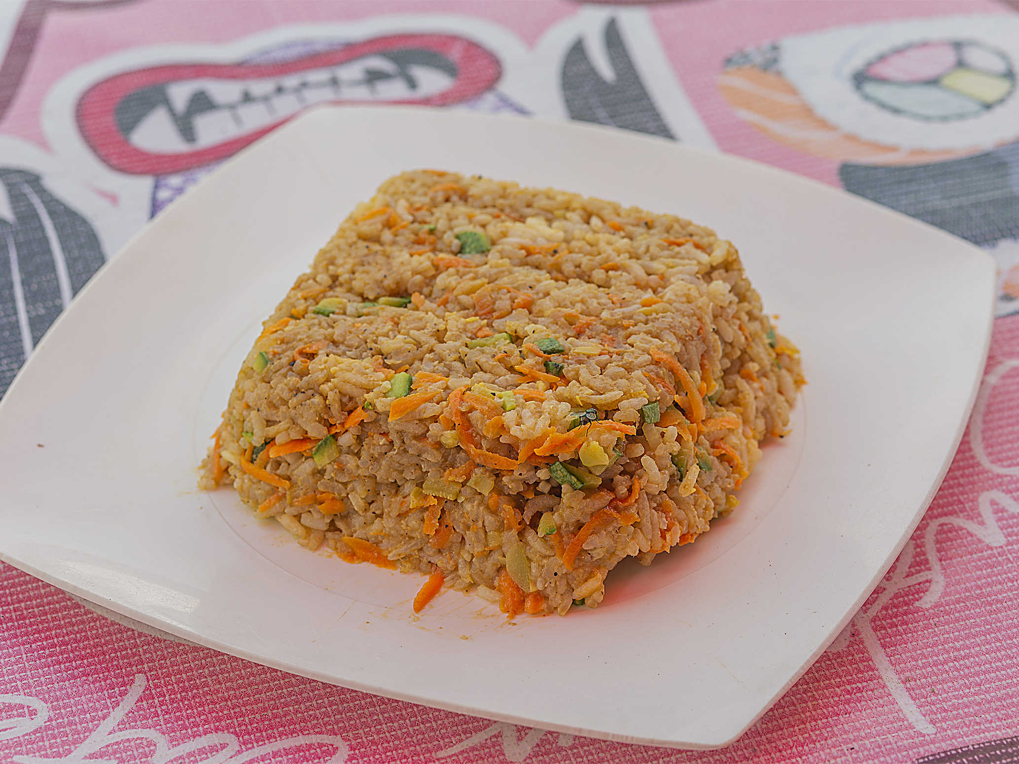 Arroz blanco, sazonado con calabaza y zanahoria, acompañado de proteína y salsa de anguila.