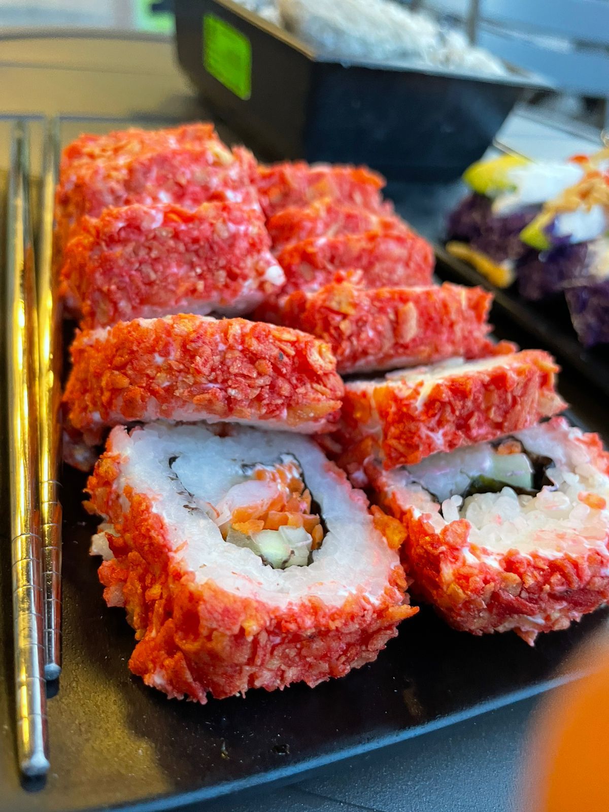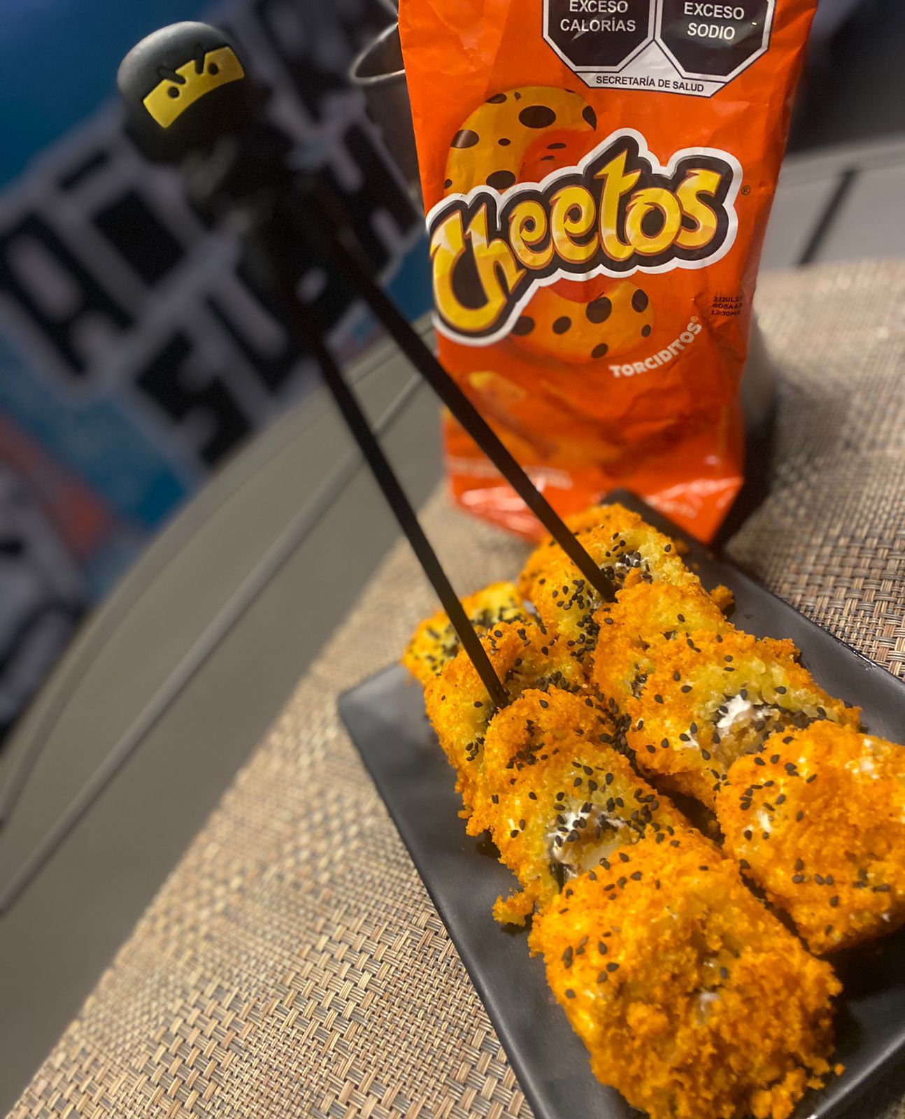 Por dentro pepino, philadelphia, camarón y zanahoria por fuera forrado de Philadelphia y Takis fuego.