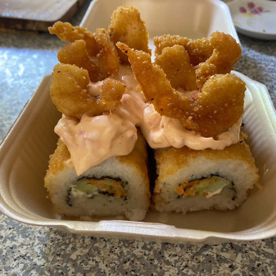 Camarón empanizado con topping de surimi y aguacate, contiene pescado, contiene mariscos.