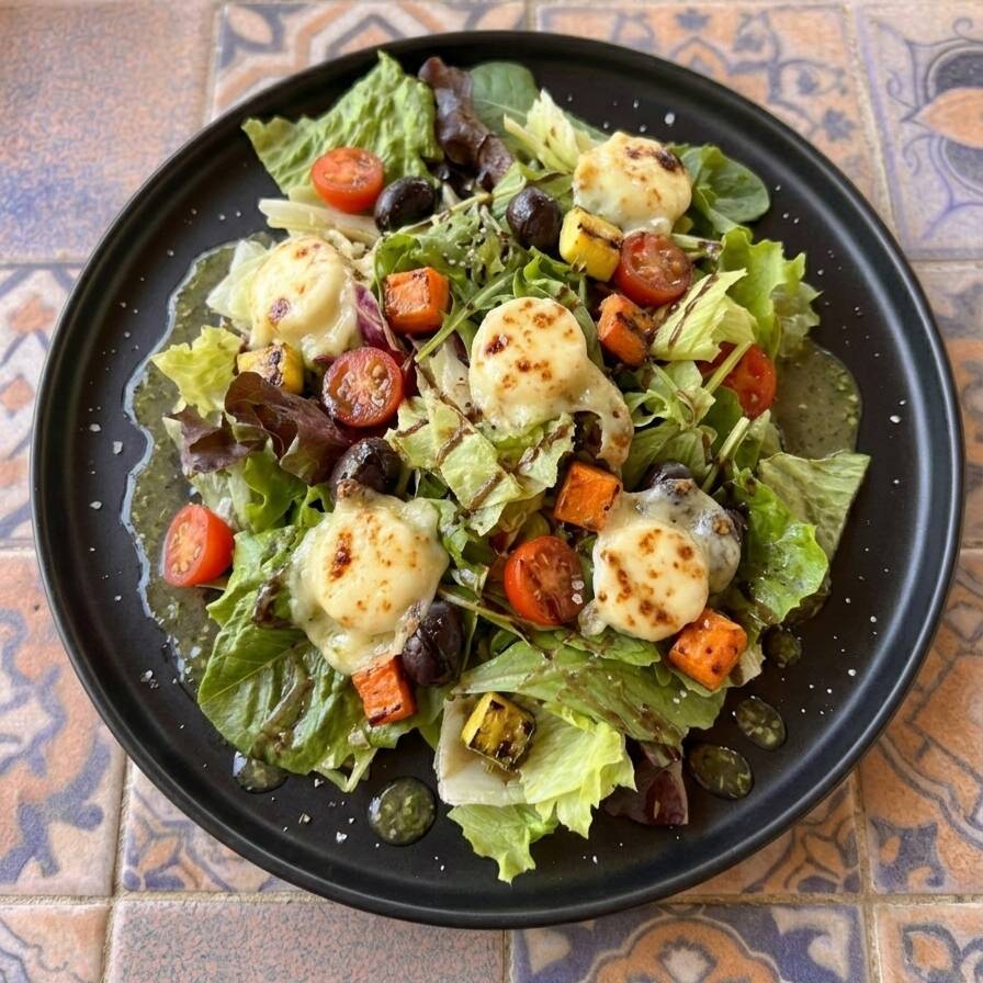 Lechugas mixtas con trozos de calabaza, zanahoria asadas, queso provolone y bañada de vinagreta de albahaca.