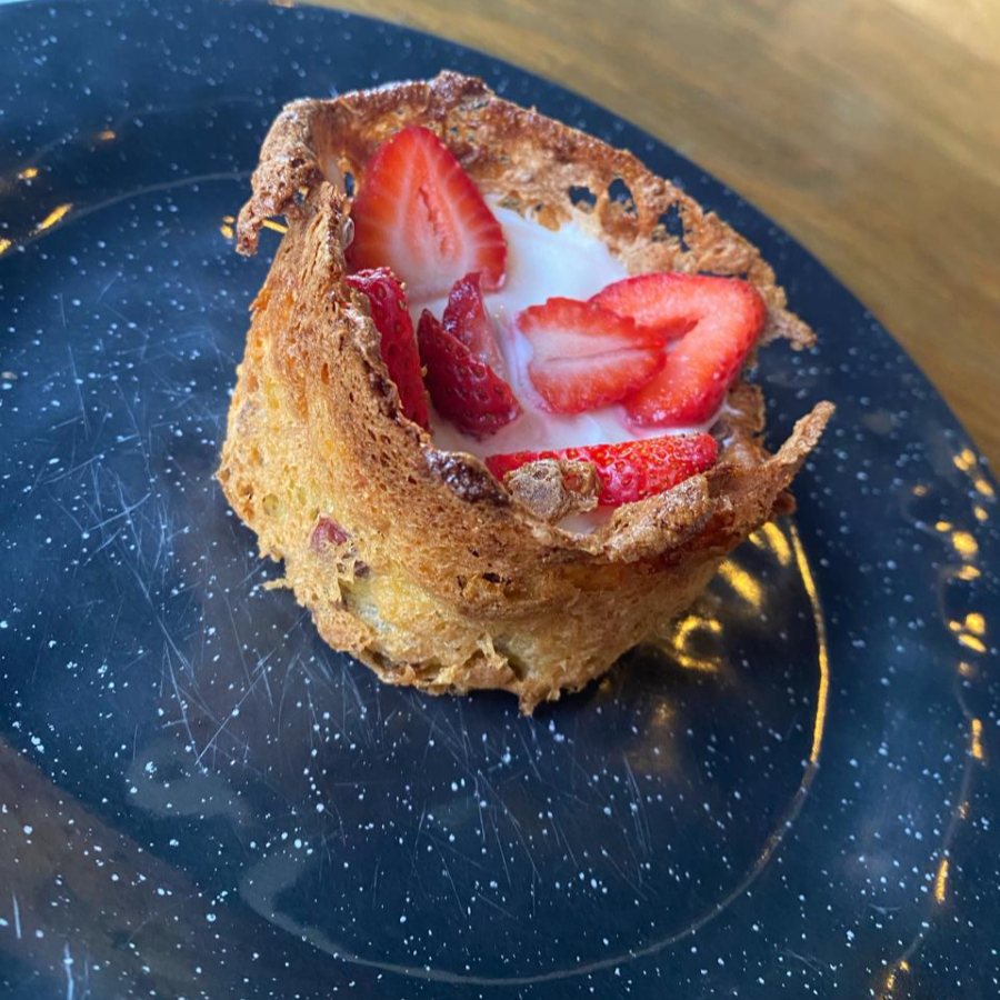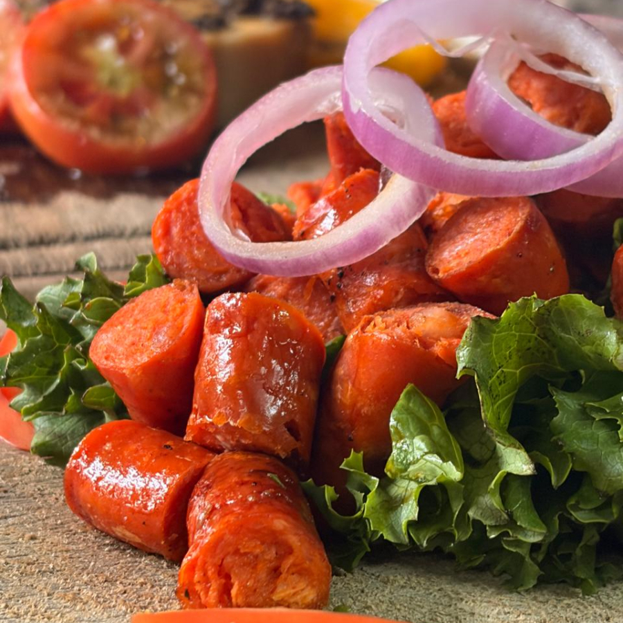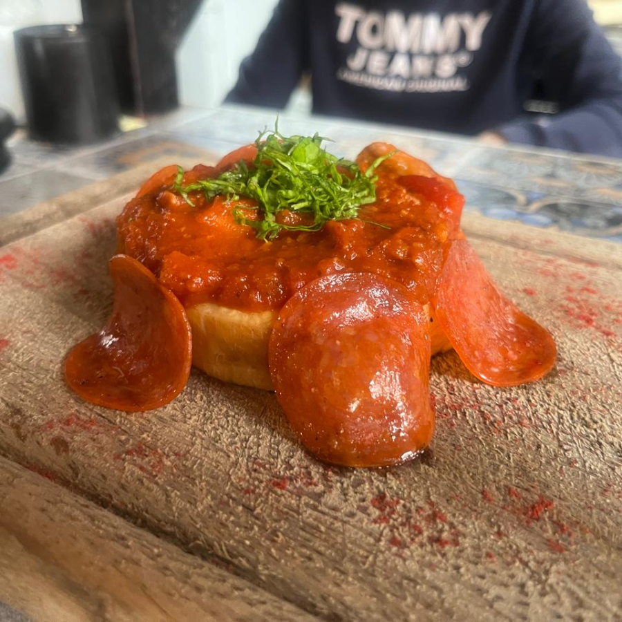 Queso semi maduro horneado, acompañado de una cama de salami bañada de salsa comodoro, con un toque de albahaca.
