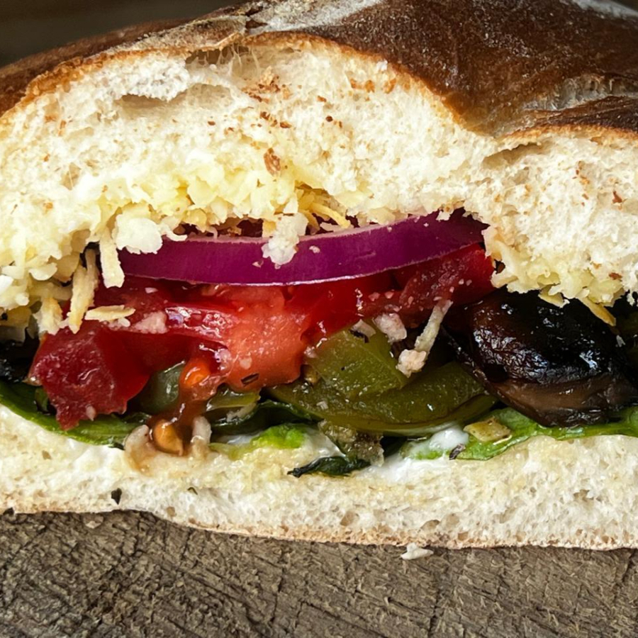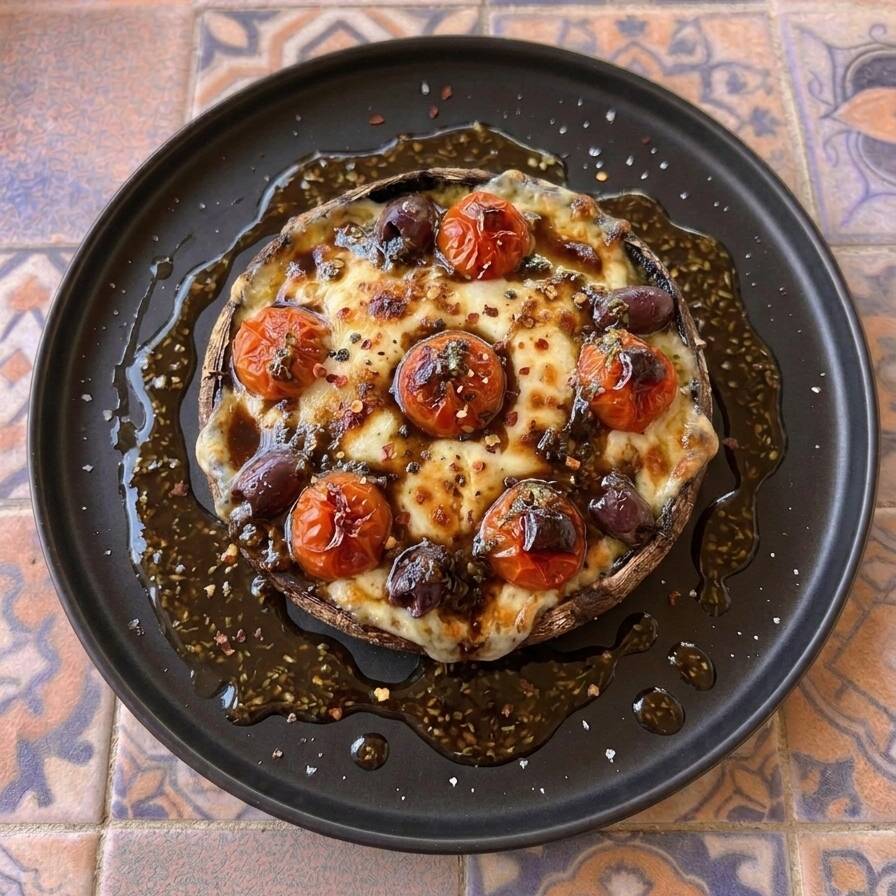 Gratinado con queso Provolone y jitomate cherry con un toque de vinagreta de albahaca.