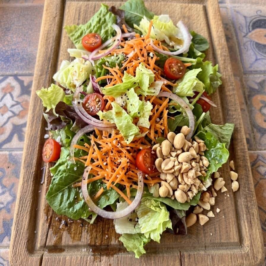 Lechuga mixta, zanahoria rallada, cebolla morada, ajonjolí, jitomate salade y bañada en vinagreta de limón.