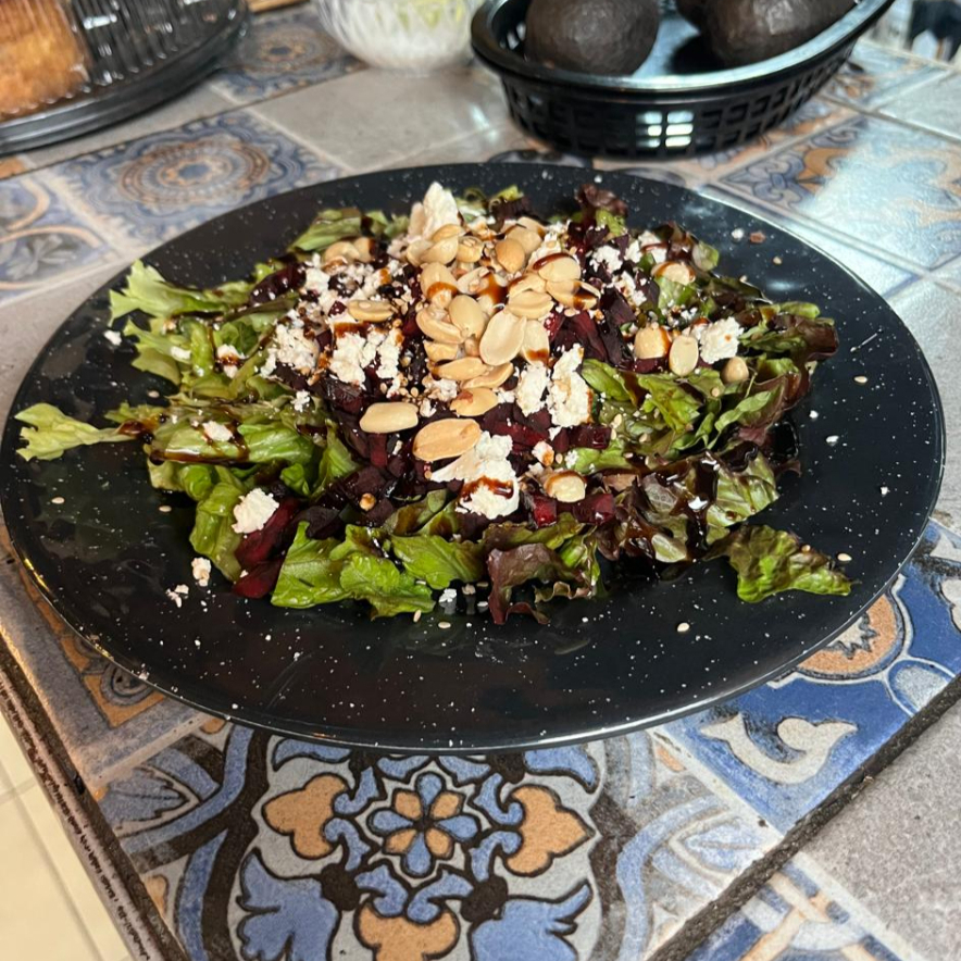 Lechugas mixtas, trozos de betabel, queso de cabra, semillas y bañada de reducción balsámico.