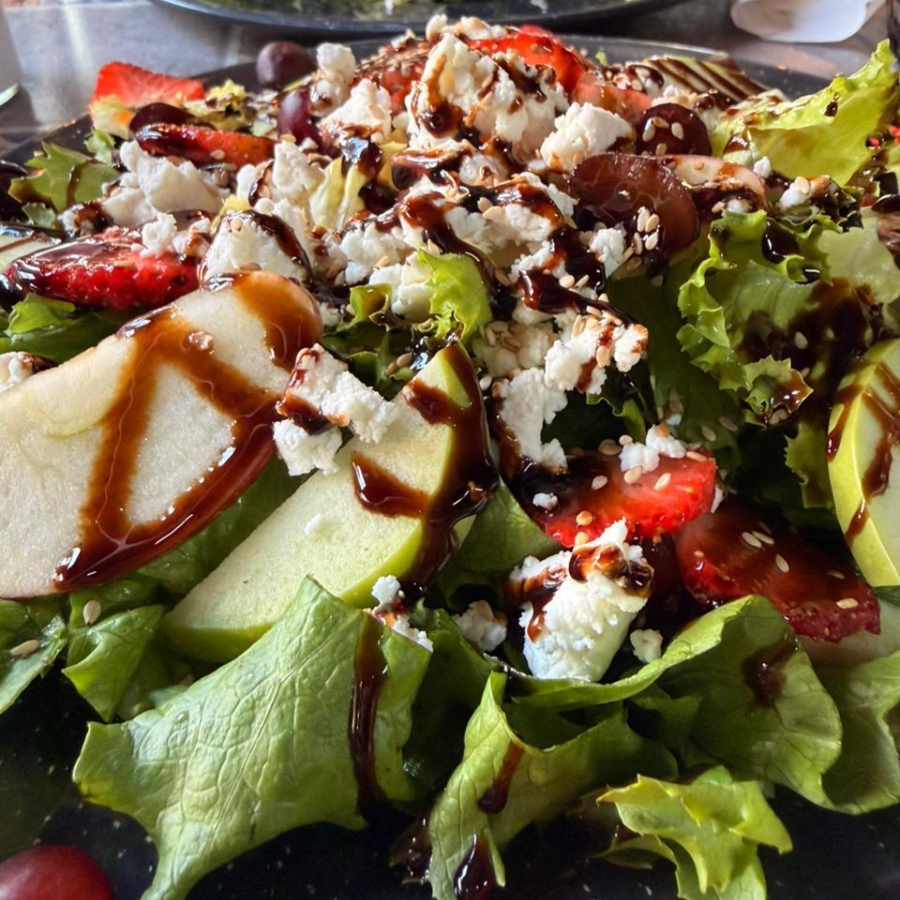 Lechugas mixtas, acompañada con rodajas de fresa, uva, manzana y bañada de reducción balsámico y semillas.