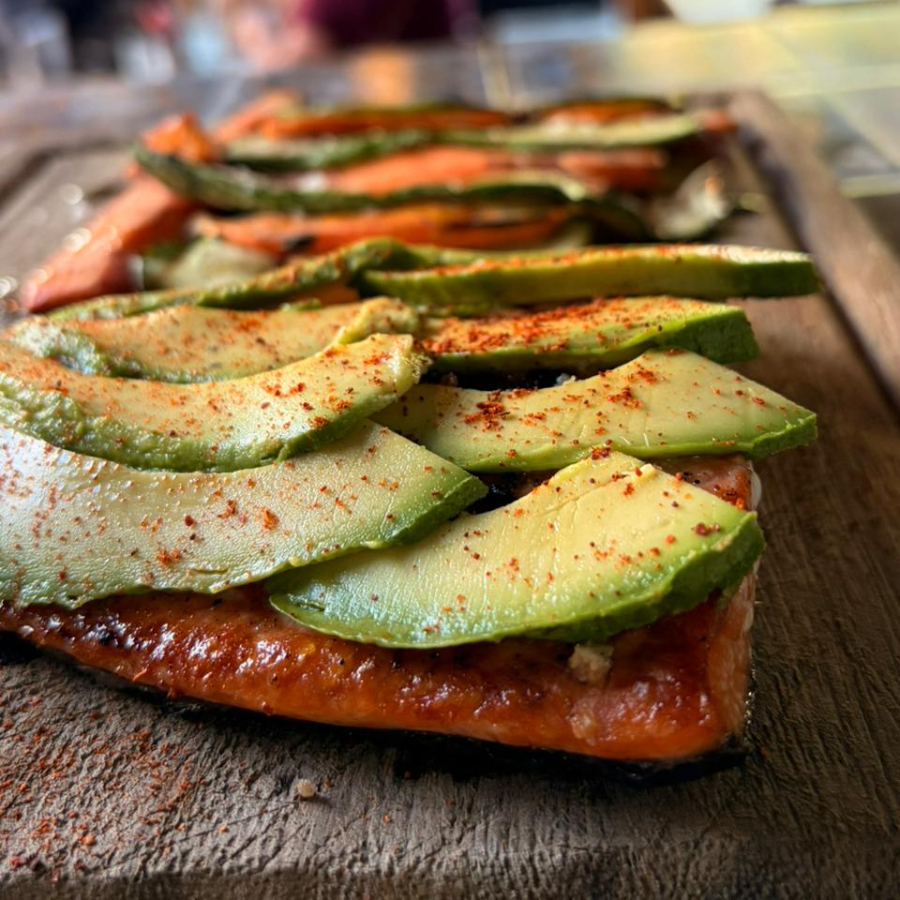 Acompañada de una cama de lechugas mixtas, cebolla morada, jitomate y bañado de chimichurri.