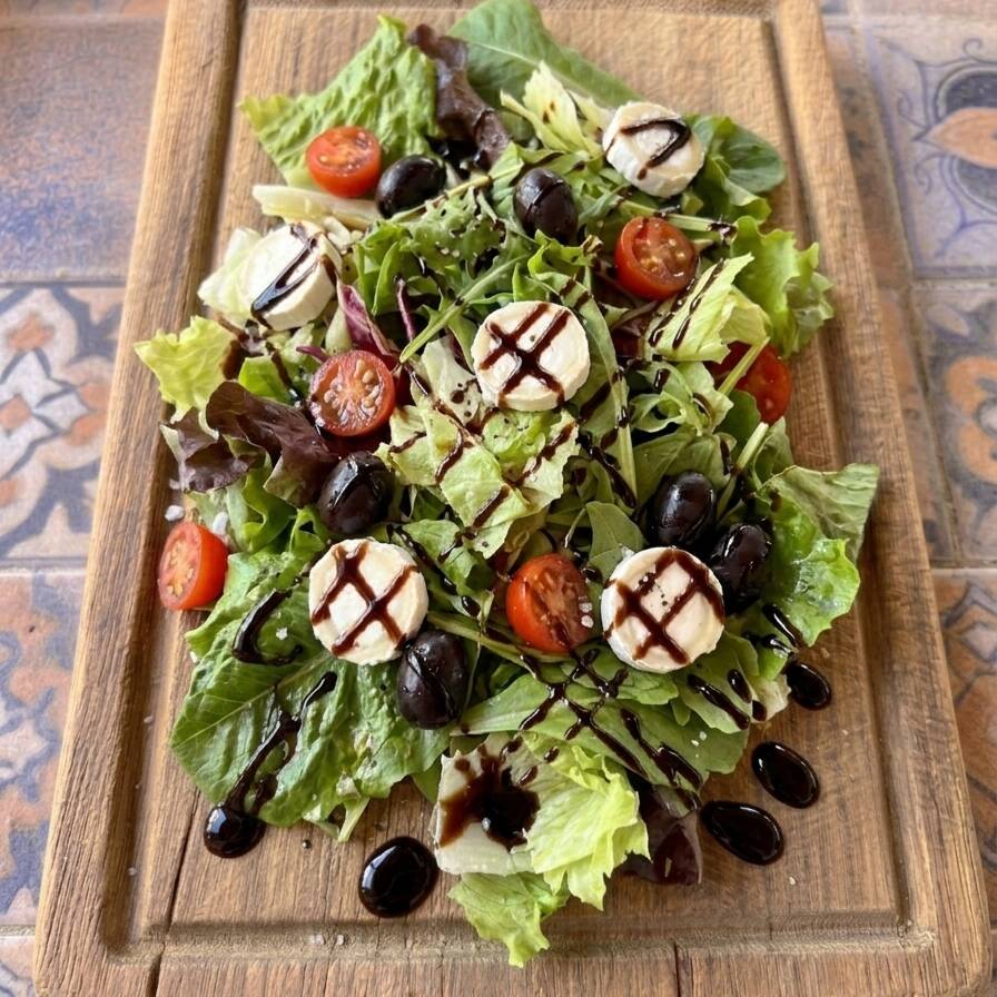 Lechuga mixta, espinaca, tomate Cherry, aceituna verde, arúgula, queso de cabra y bañada con reducción de durazno.