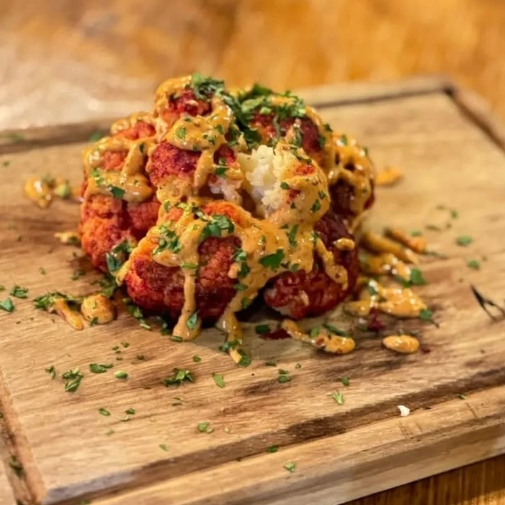 Coliflor asado, sazonado con especias y bañado con aderezo de chipotle.