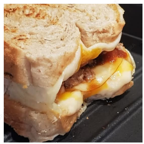 Queso ahumado, cheddar y manchego fundidos en rebanadas de pan de masa madre con hierbas finas.