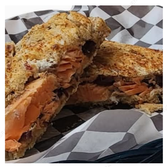 Salmón ahumado en pan de hierbas con queso crema y cebolla caramelizada en chipotle y frambuesa.