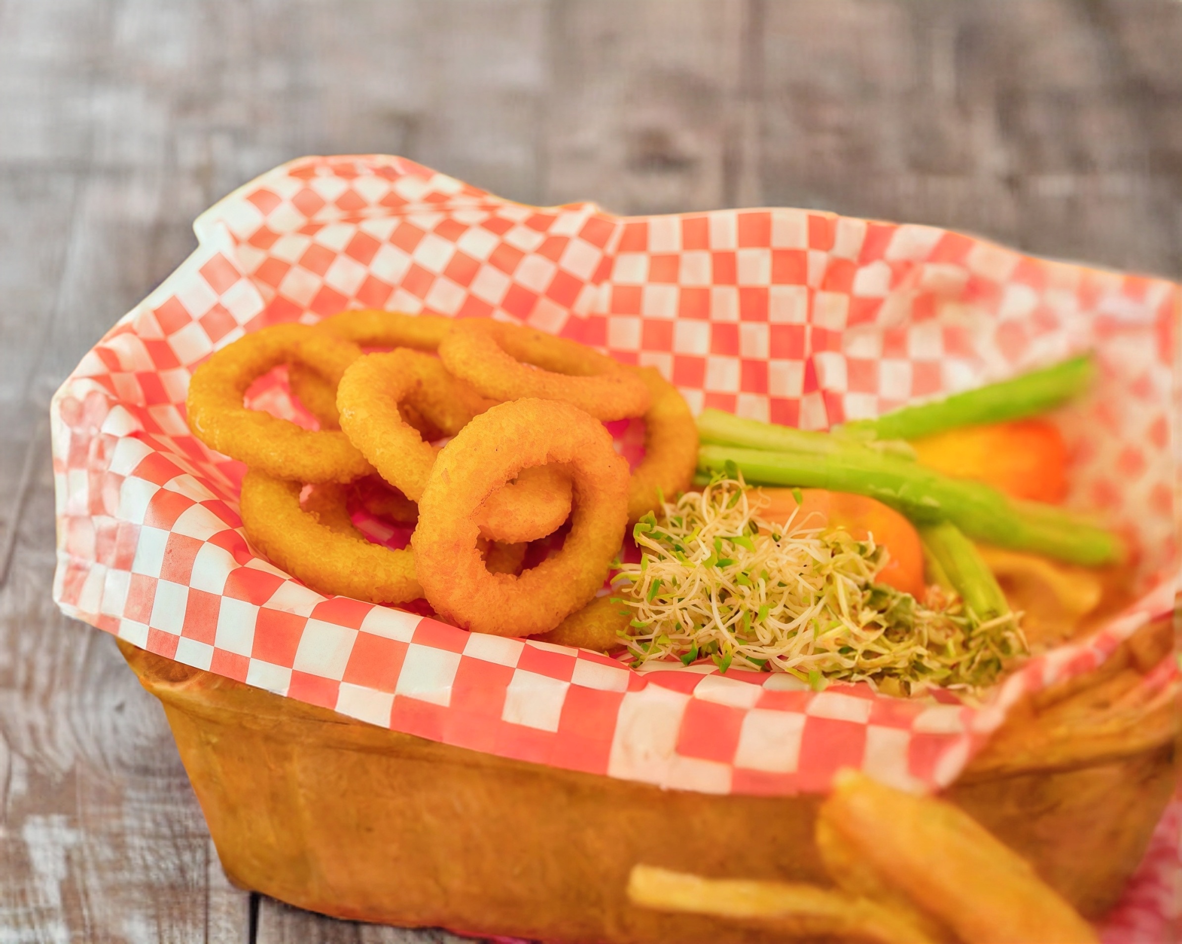 Deliciosa hamburguesa de tender, 2 aros de cebolla, lechuga italiana, cebolla, jitomate, Bbq, ranch y acompañada de su porción de papas a la francesa