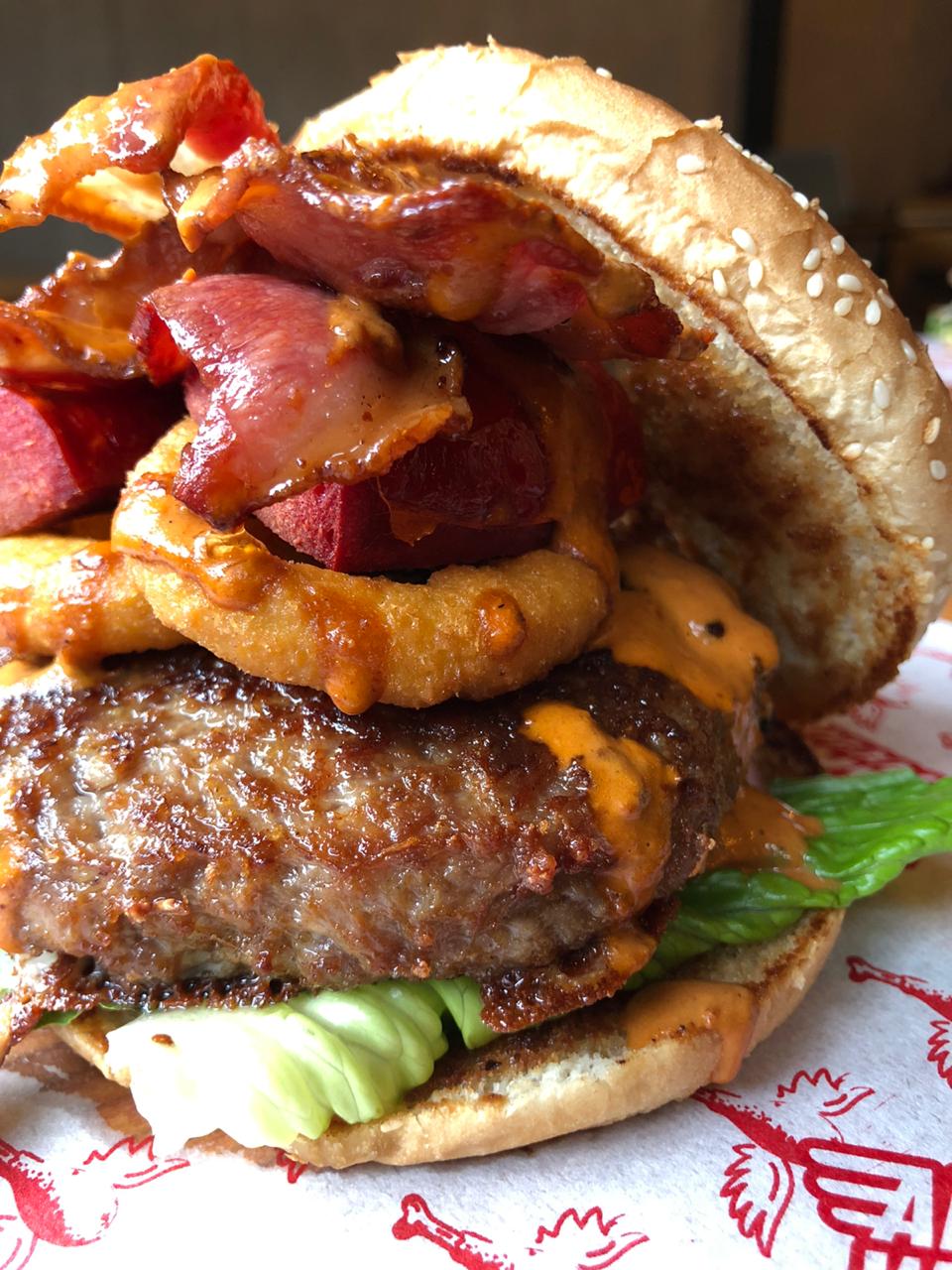 Doble carne de res, aros de cebolla, tocino, salchicha para asar y aderezo chipotle