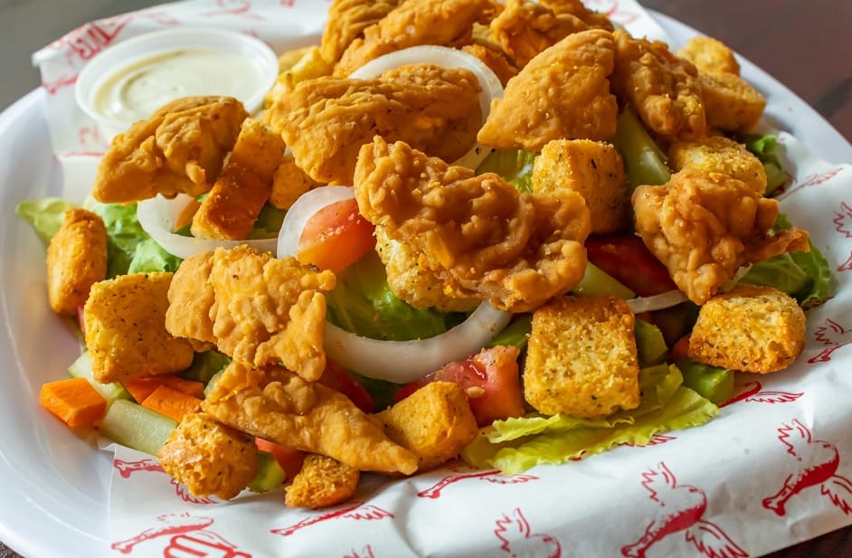 Ensalada con pollo empanizado, con croutones y ranch