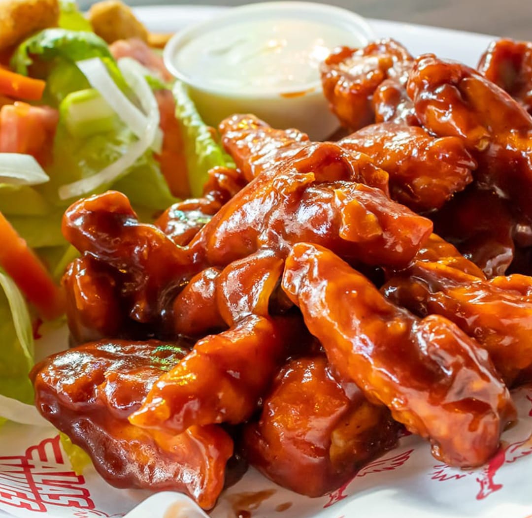 500 gramos de deliciosos boneless de pollo, con salsa a tu elección. Incluye aderezo ranch