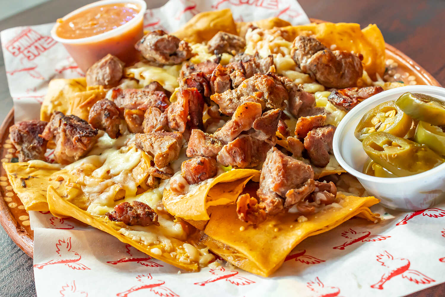 Totopos gratinados con frijoles queso y arrachera, salsa mexicana y jalapeños en rodajas