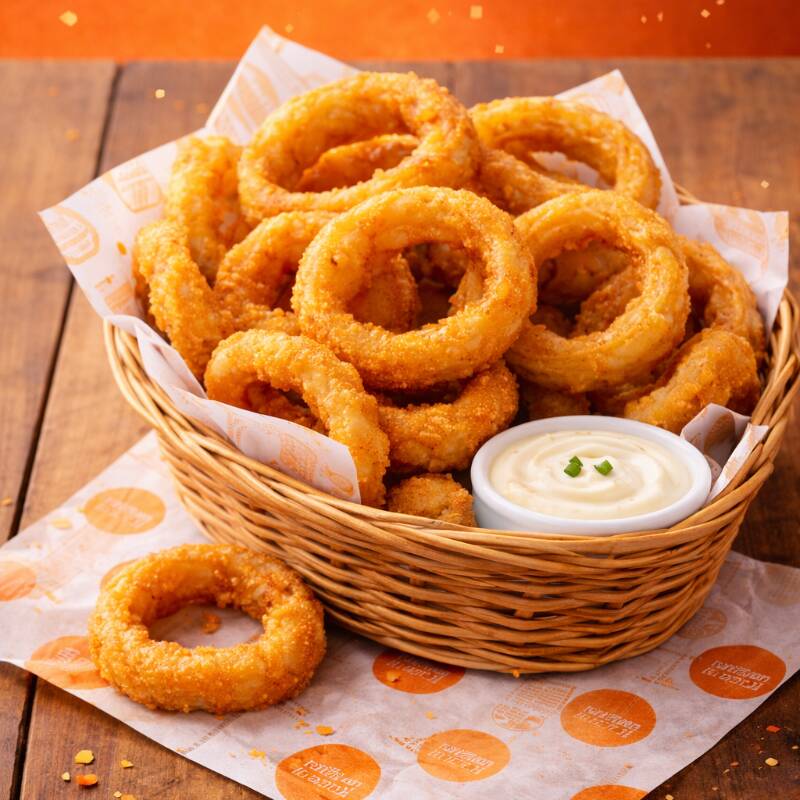 Aros de cebolla crujientes, dorados al momento, con sazón clásico y porción ideal para botanear.