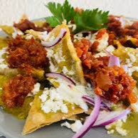 totopos de maiz bañados en salsa roja o verde , acompañado de 1 huevo al gusto