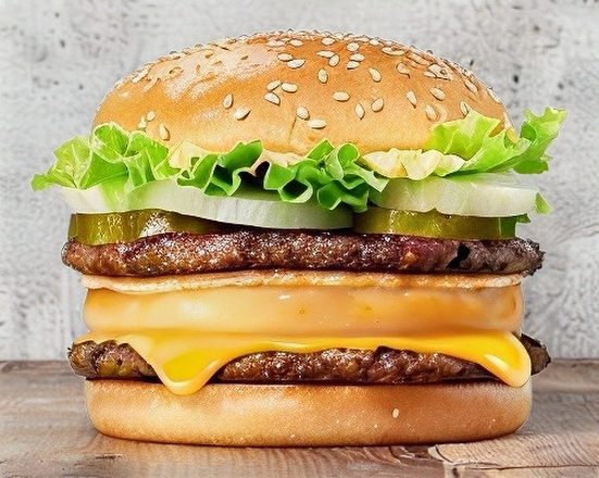 Hamburguesa con doble carne 100% de res, cubierta en queso americano, lechuga, jitomate y cebolla.