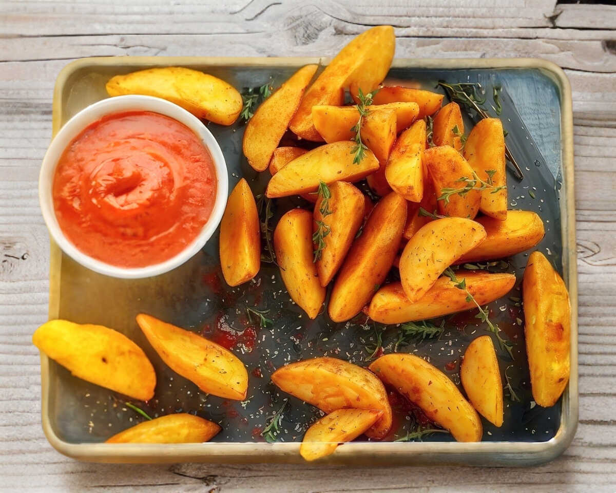380 g De papas gajo y salsa favorita por separado.