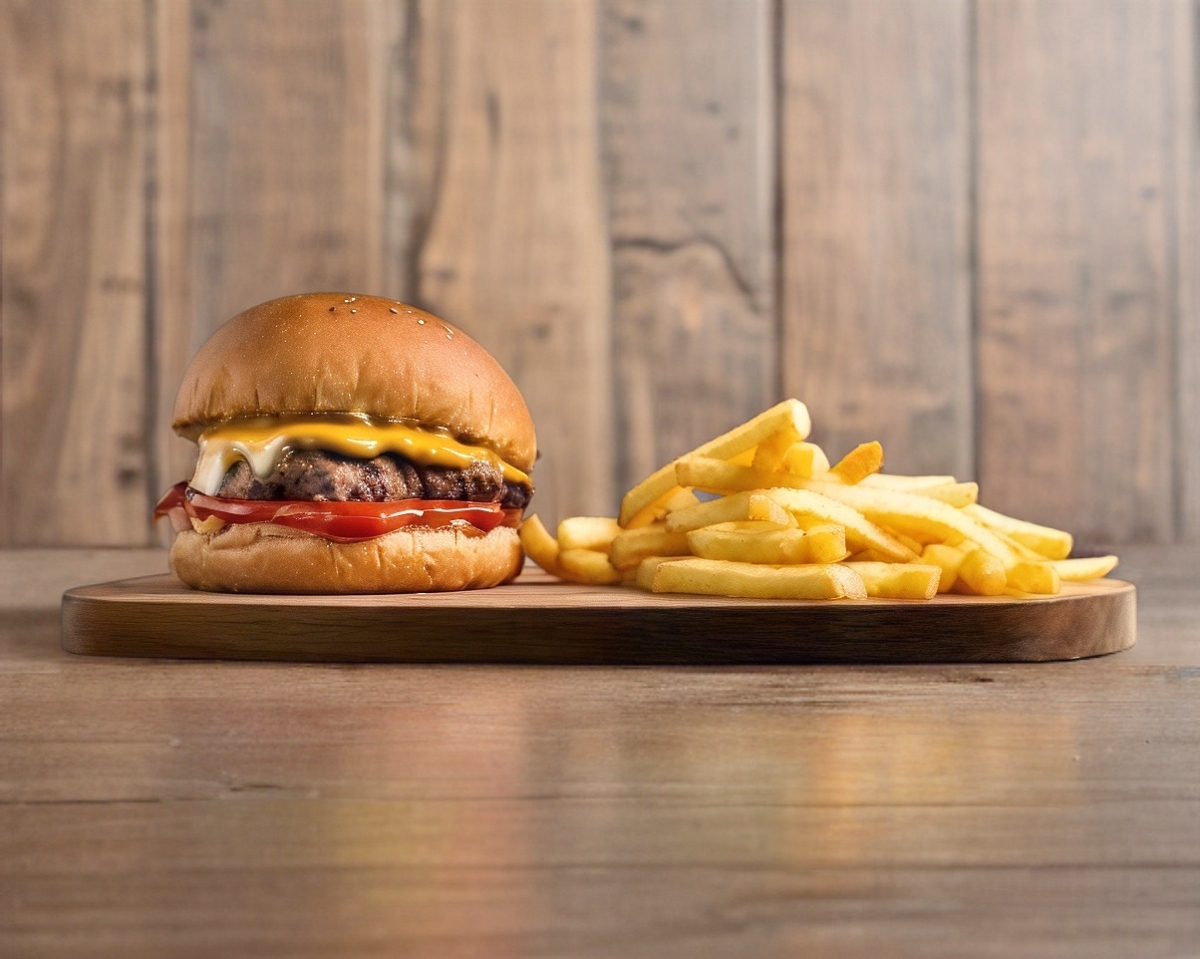 Hamburguesa con carne 100% de res con papas a elegir, cubierta en queso americano, lechuga, jitomate y cebolla.
