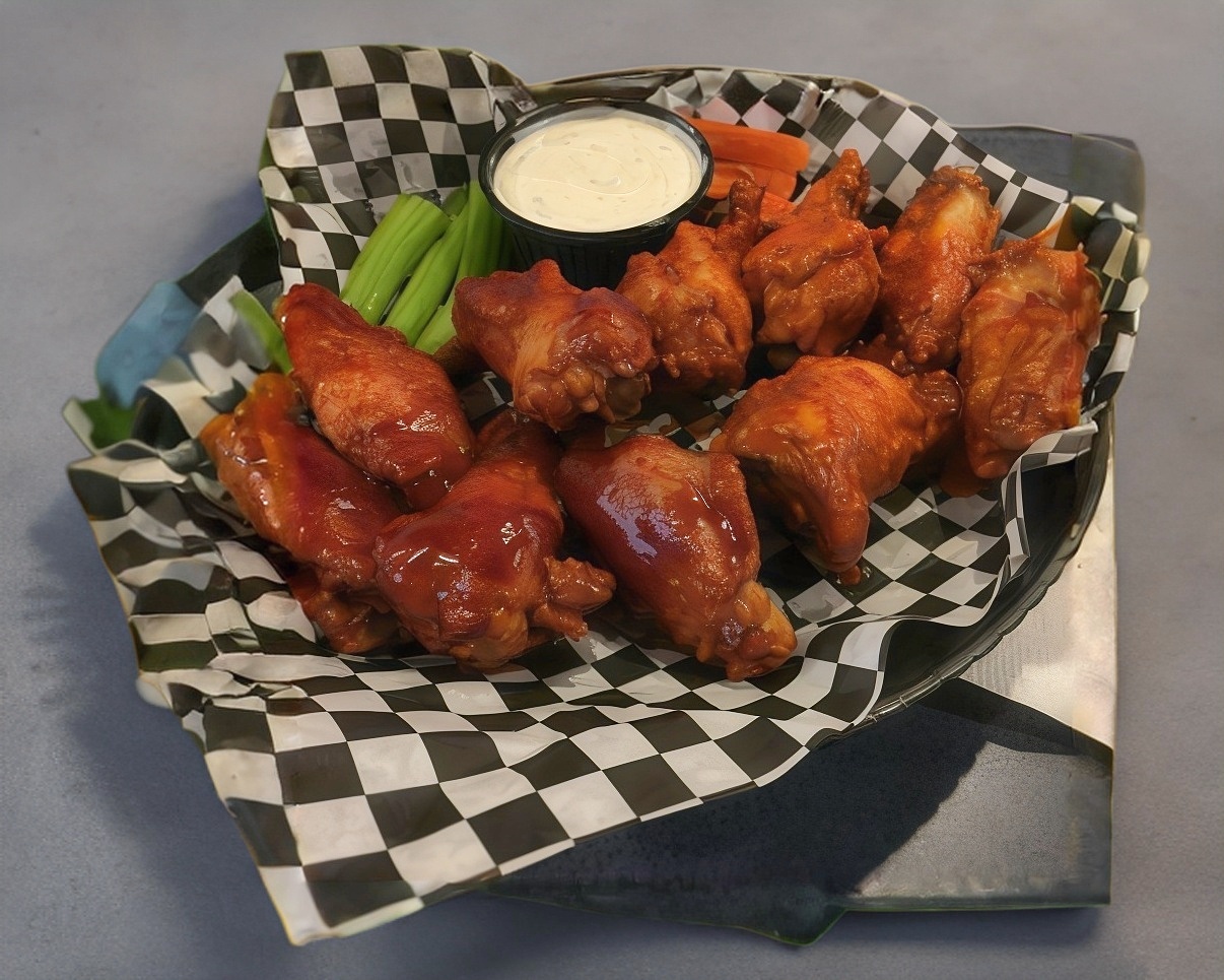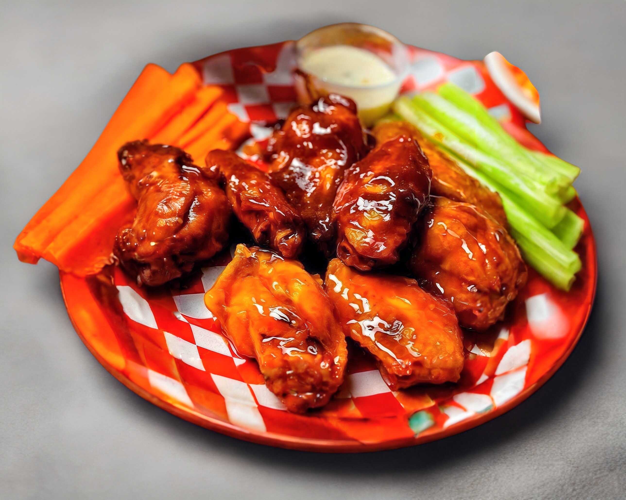 Deliciosa alitas bañadas en la salsa de tu preferencia acompañadas de aderezo ranch, zanahoria y apio