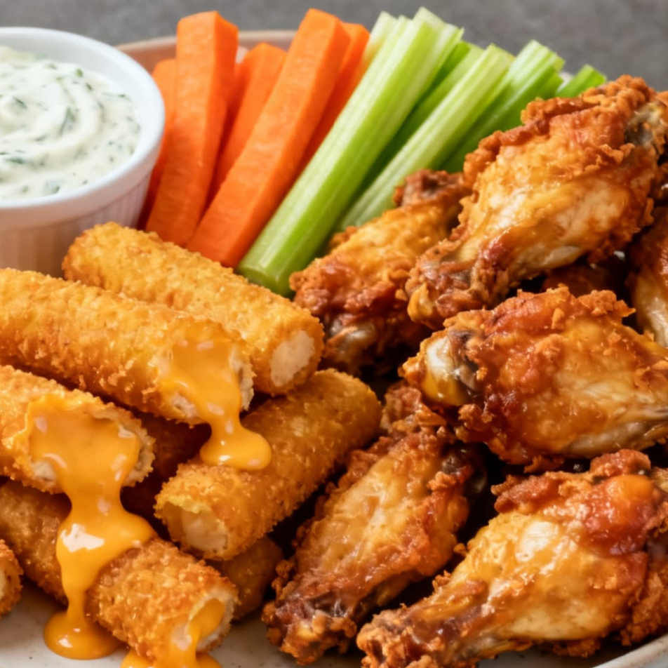 Deliciosos Bonless echos en casa bañados en la salsa de tu preferencia acompañados de aderezo ranch, zanahoria y apio