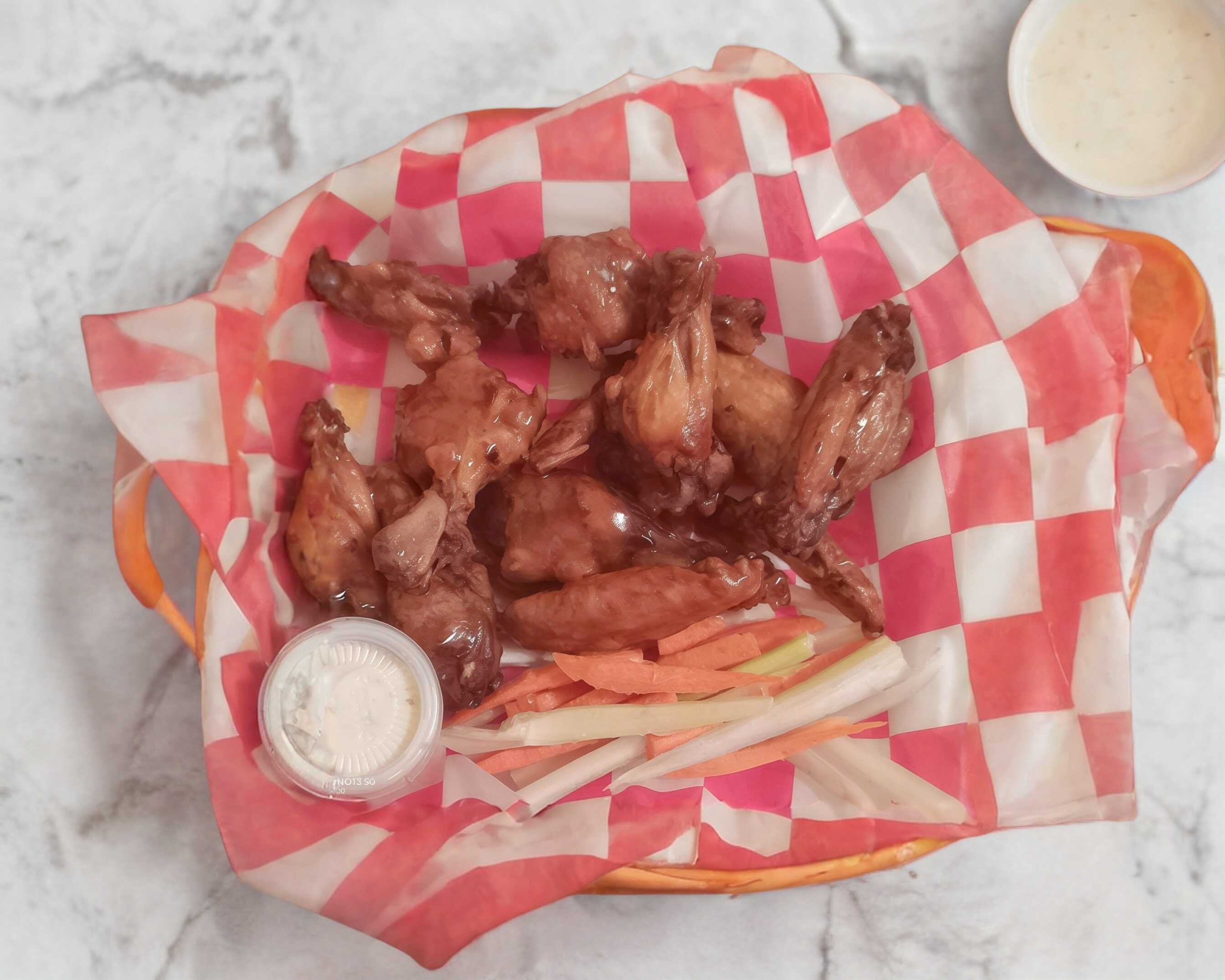 Alitas 10 alitas de pollo salsa a elegir y aderezo Ranch. con complemento de zanahoria y apio.