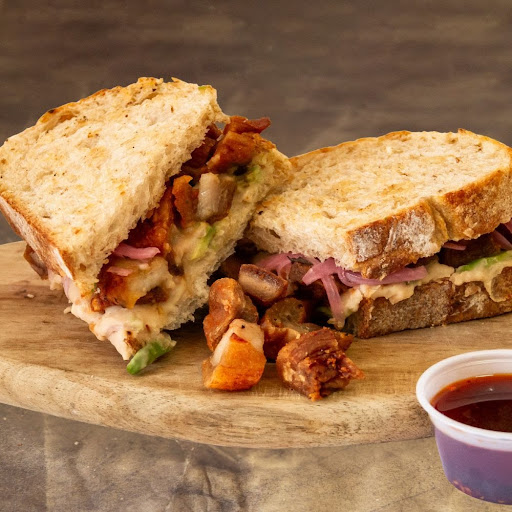 Toast de Pollo Artesanal. Pechuga sazonada, aguacate cremoso y queso fundido en pan toscano crujiente. Servido con nuestro aderezo de chile tatemado.