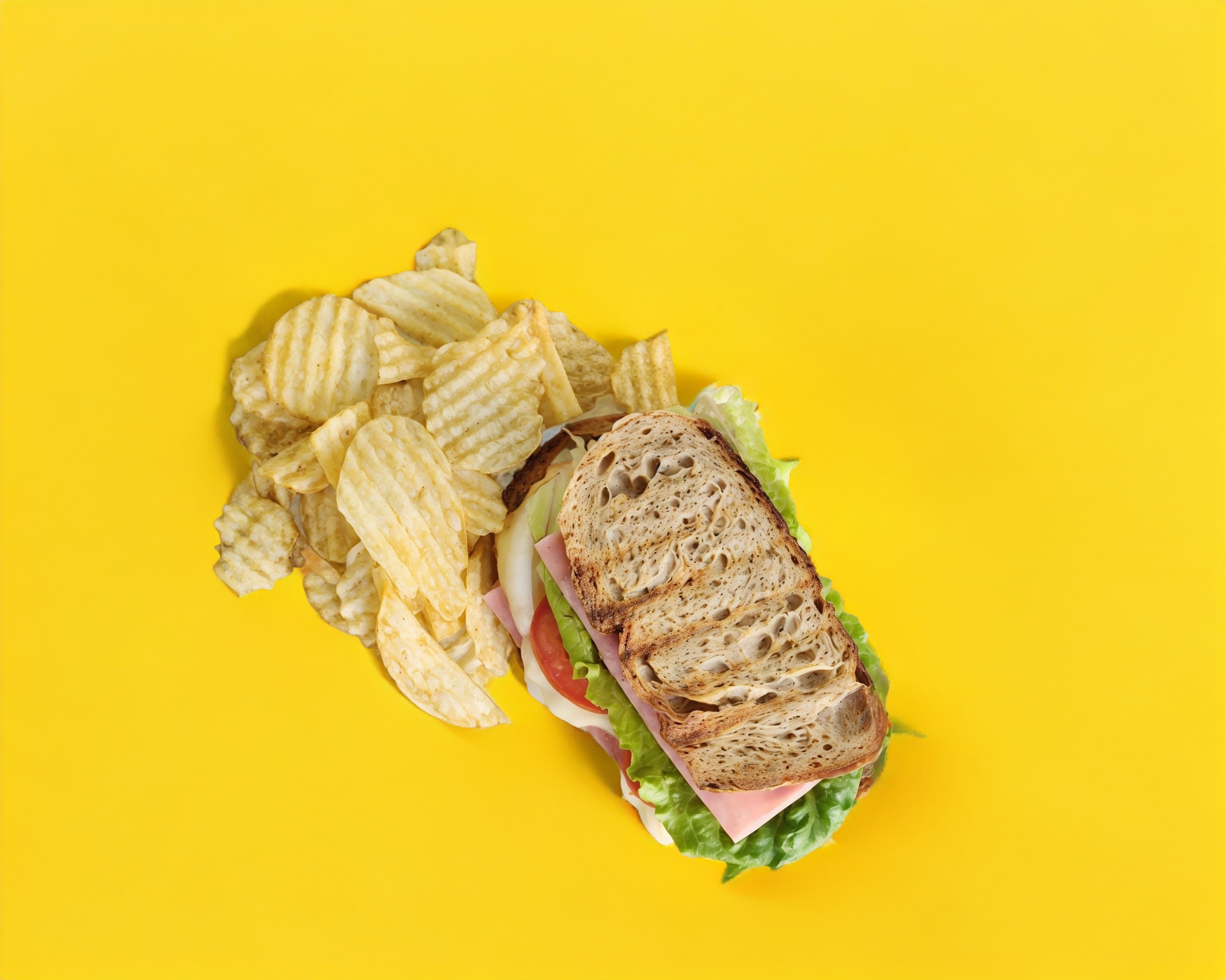Sandwich con pan de masa madre, jamón de pavo, queso manchego, cebolla, jitomate y lechuga, acompañado de papas doradas.