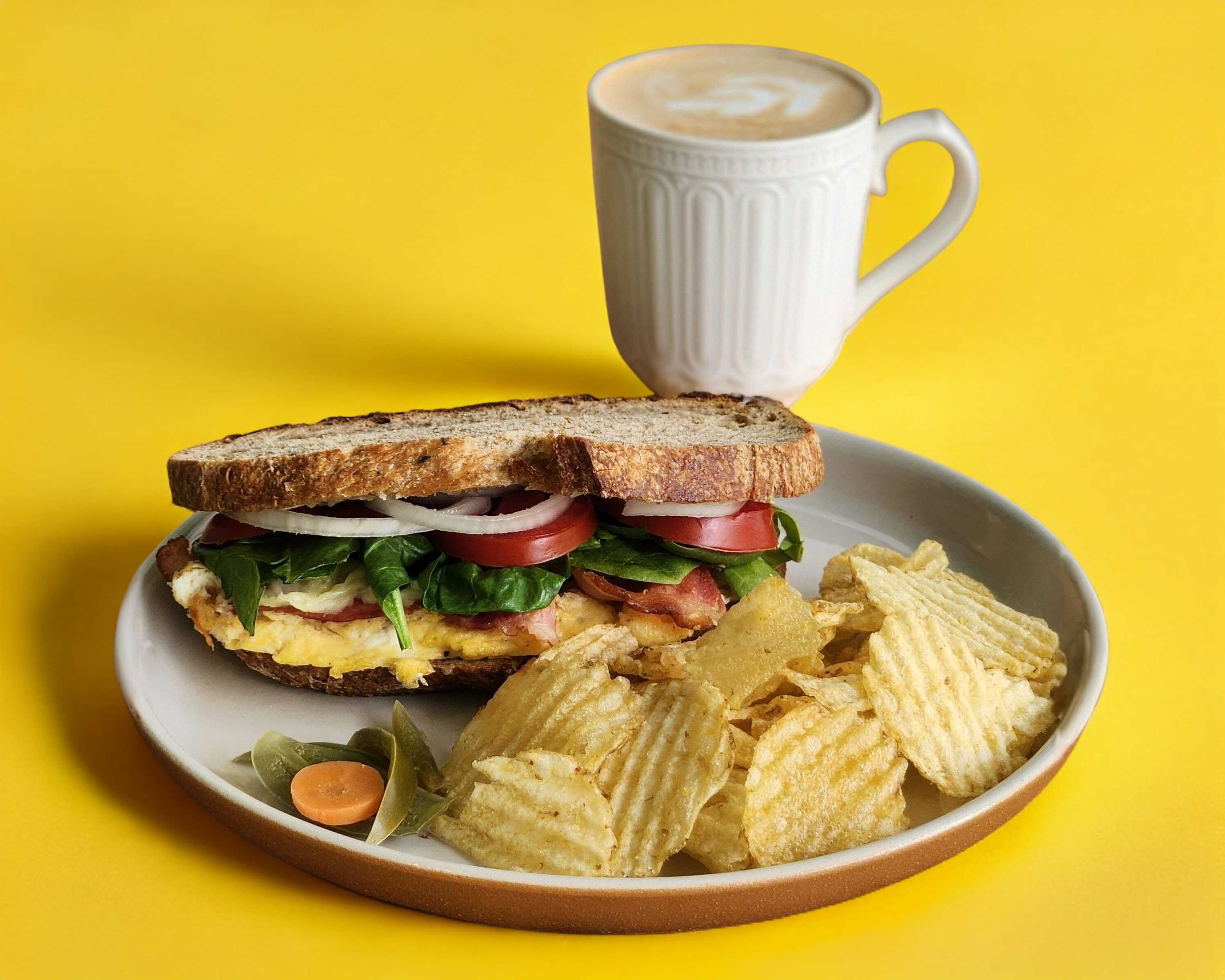 Delicioso sándwich de Huevo con Tocino, queso Manchego, Espinacas, Jitomate y Cebolla. El pan es de masa madre Orégano-Parmesano que eleva su sabor.