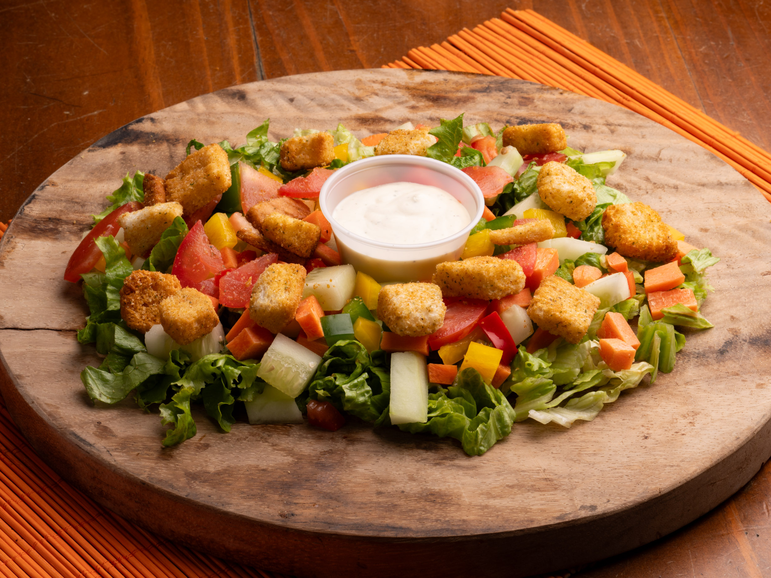 Lechuga, crotones, jitomate, pimiento morrón y zanahoria. Acompañada de nuestro Aderezo Ranch.