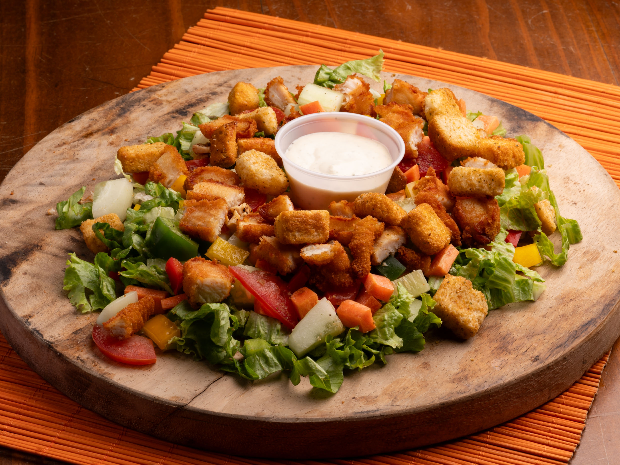 Lechuga, crotones, jitomate, pimiento morrón, zanahoria, pepino y tiras de pollo empanizado. Acompañada de nuestro aderezo Ranch y un toque de salsa AlphaCrow.