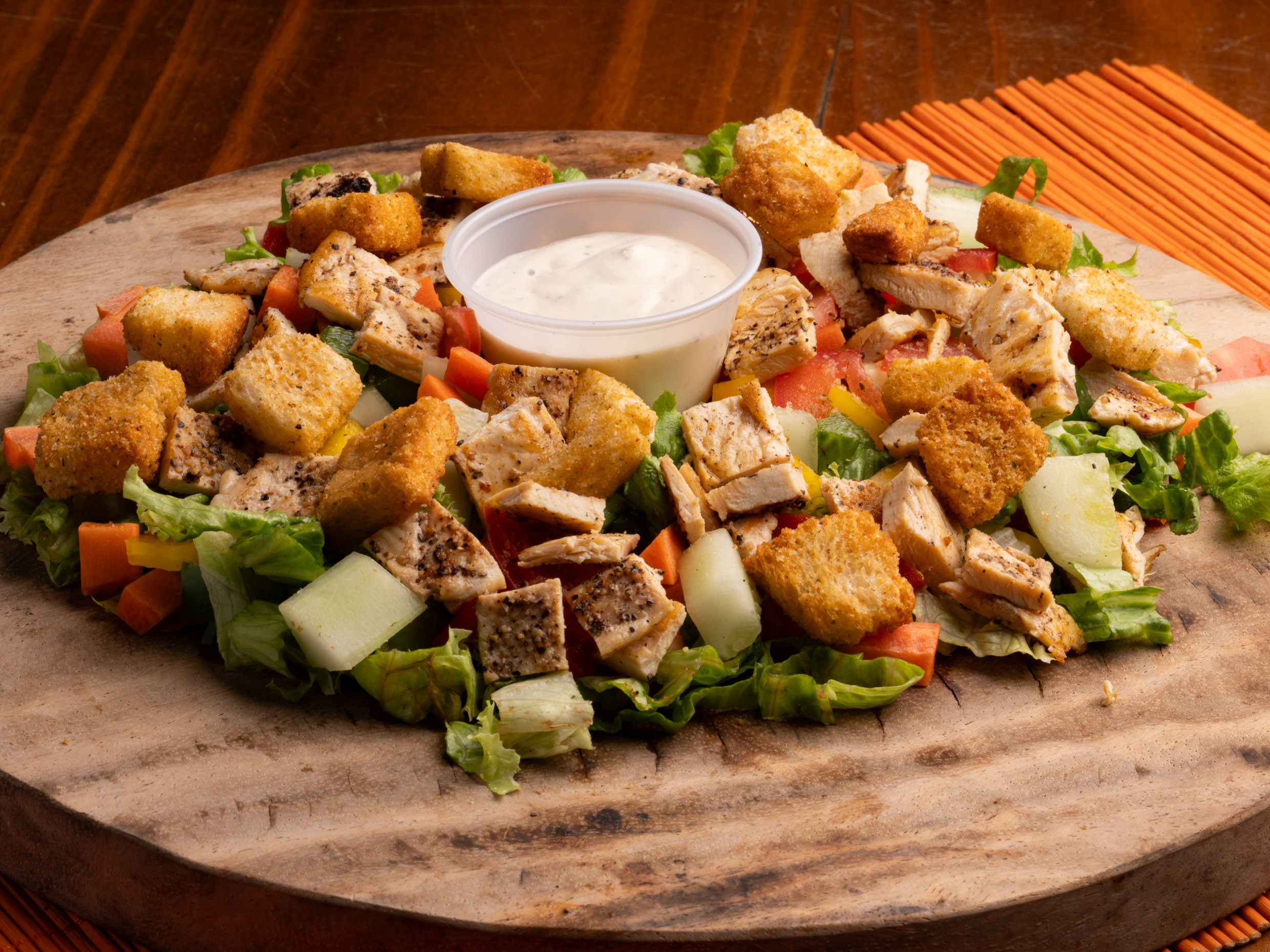 Lechuga, crotones, jitomate, pimiento morrón, zanahoria, pepino, trocitos de pollo natural, nuestro aderezo ranch y un toque de salsa AlphaCrow.