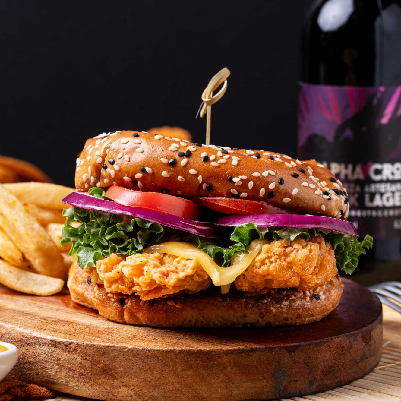 150grs Tiras de pollo empanizado, lechuga, jitomate, cebolla, queso manchego, papas a la francesa y un toque de nuestra salsa AlphaCrow.