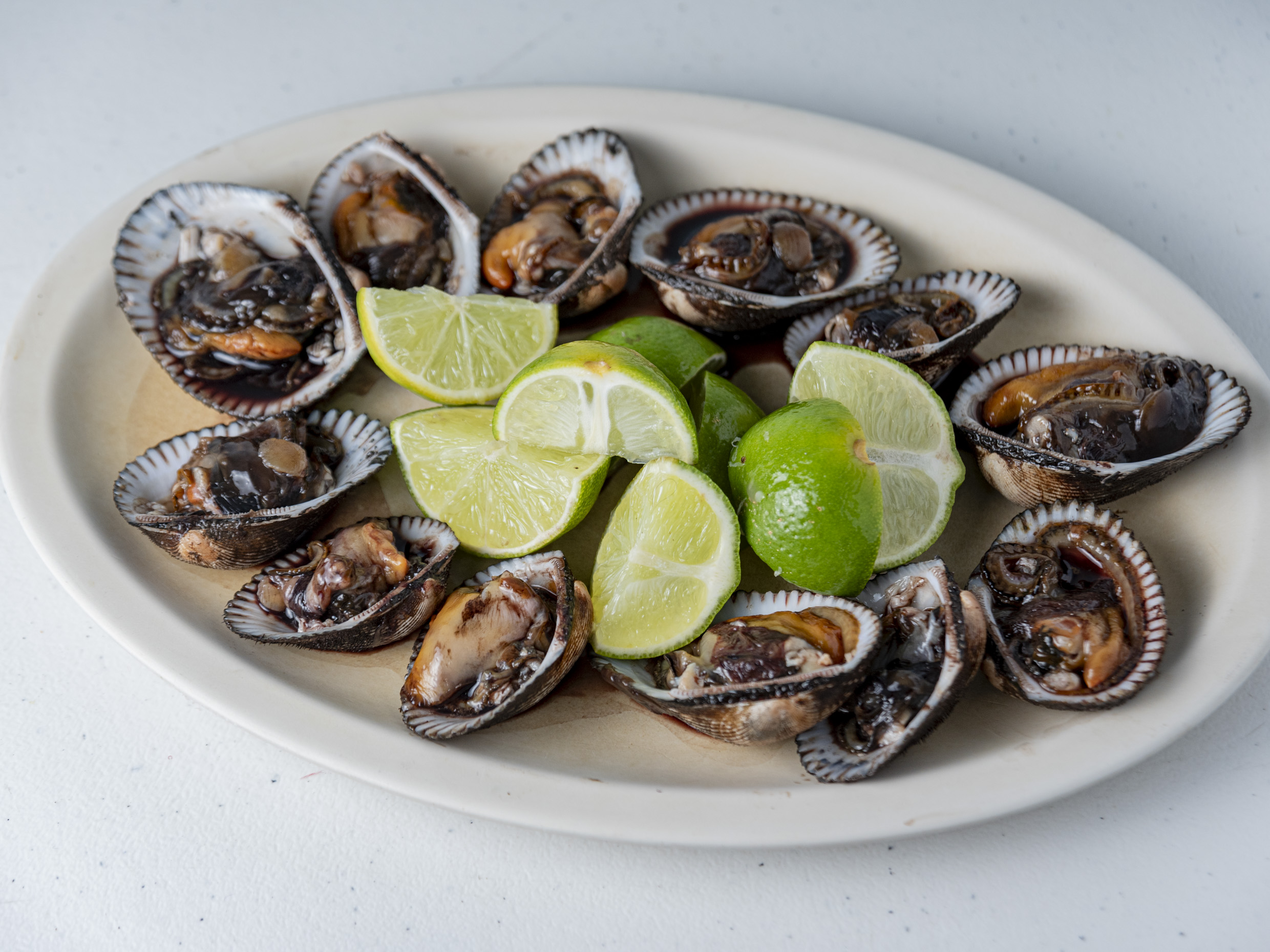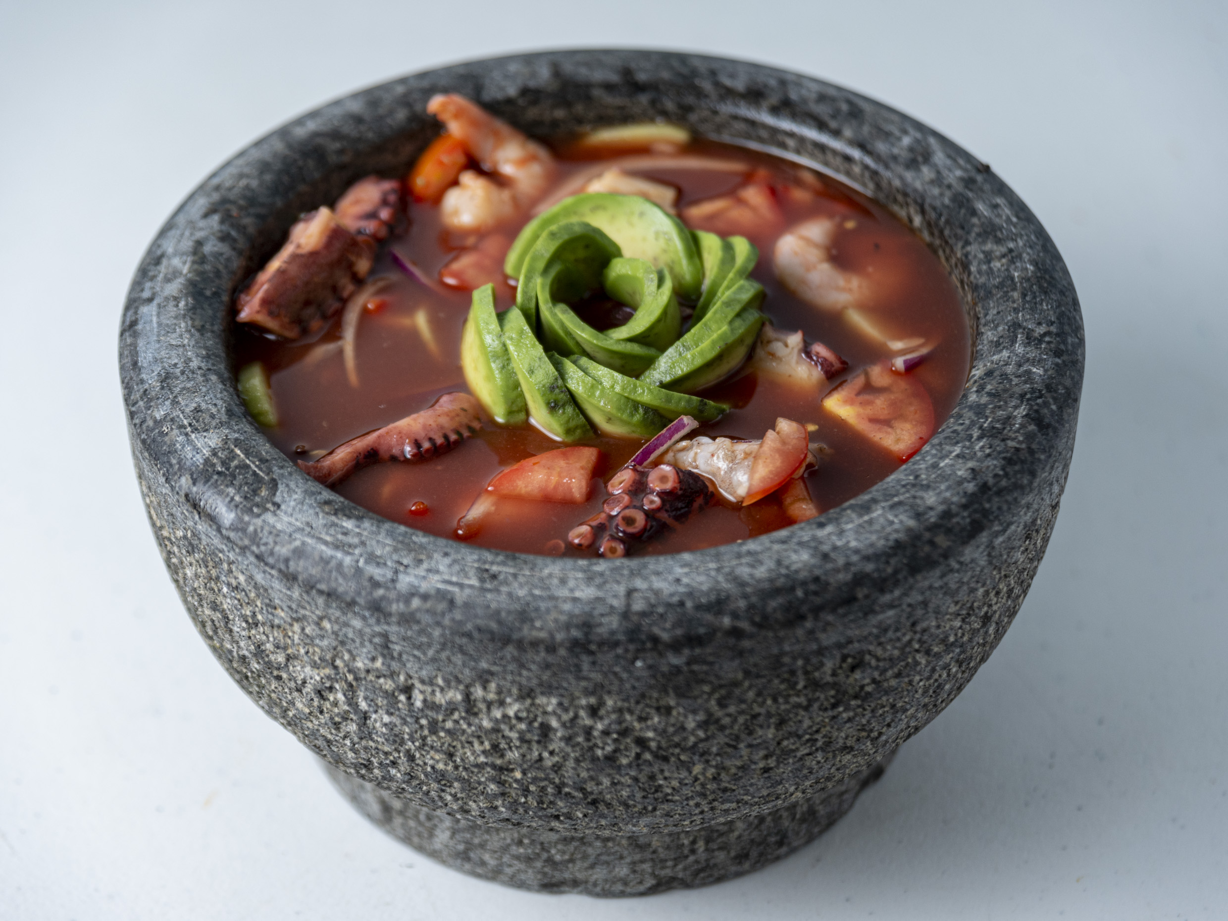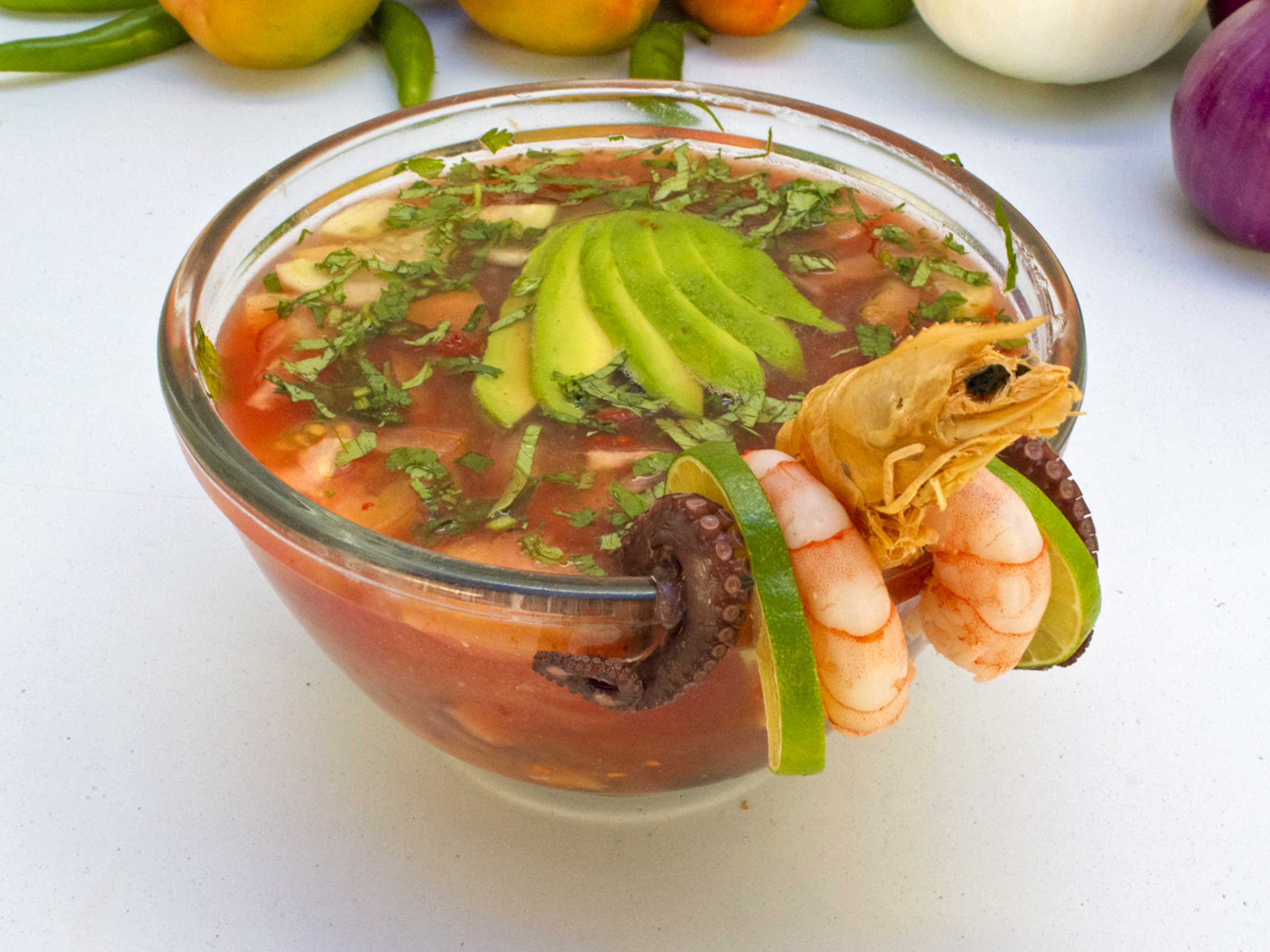 Camarón cocido,camarón curtido,pulpo,callo,bañado en salsas negras,clamato y caldo de camarón