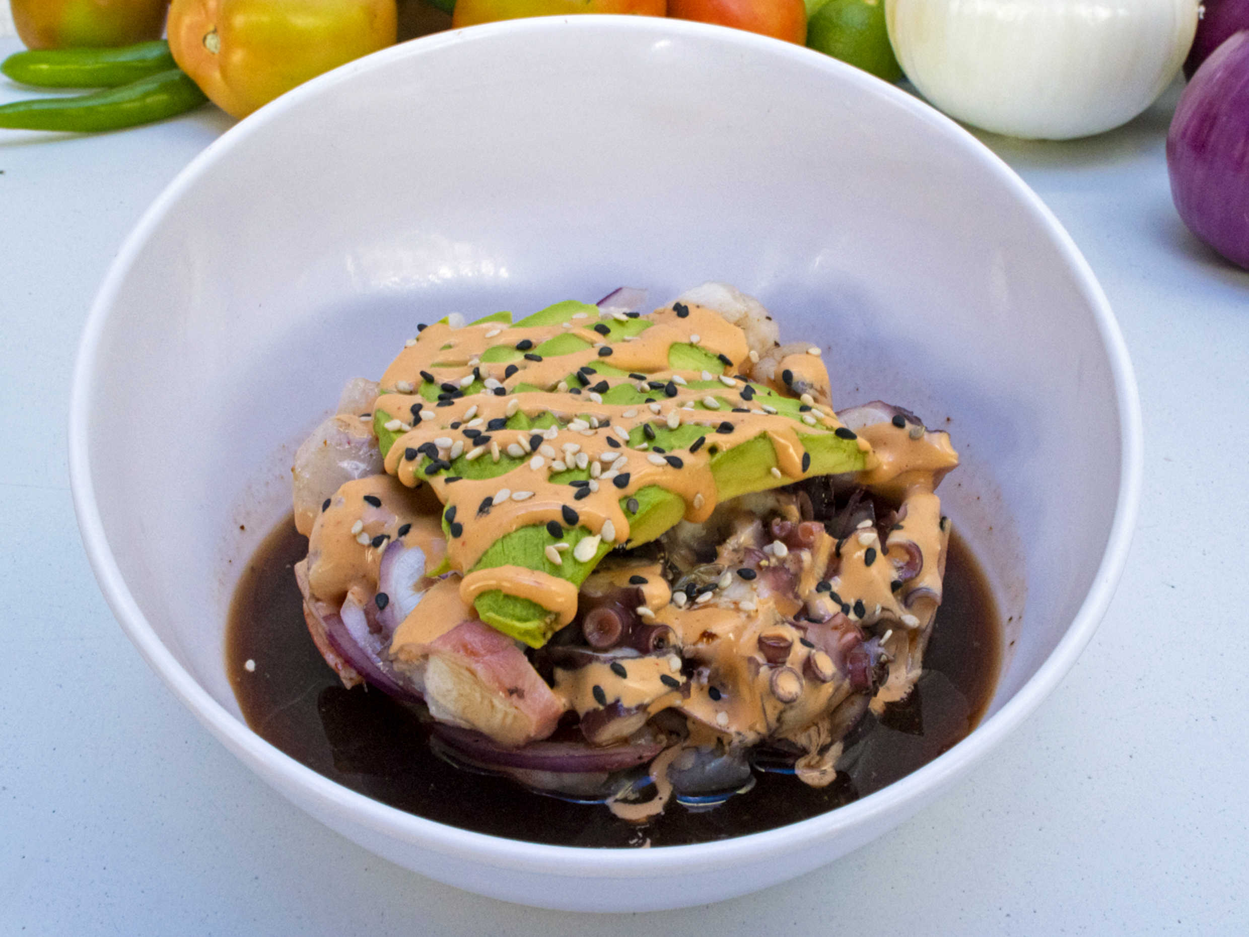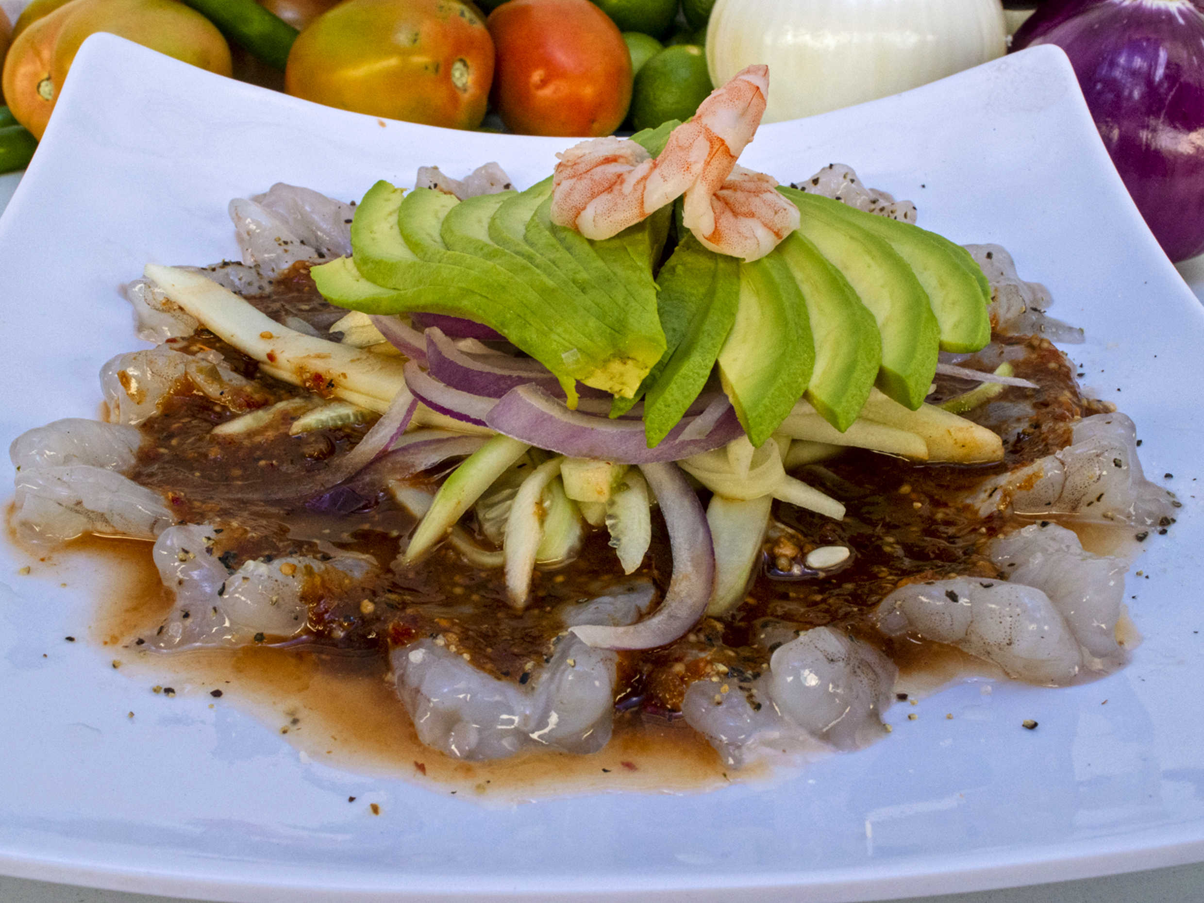 (Camarón,pulpo y callo a elegir) servida en cama de mayonesa,jitomate,cebolla,pepino,cilantro,y aguacate