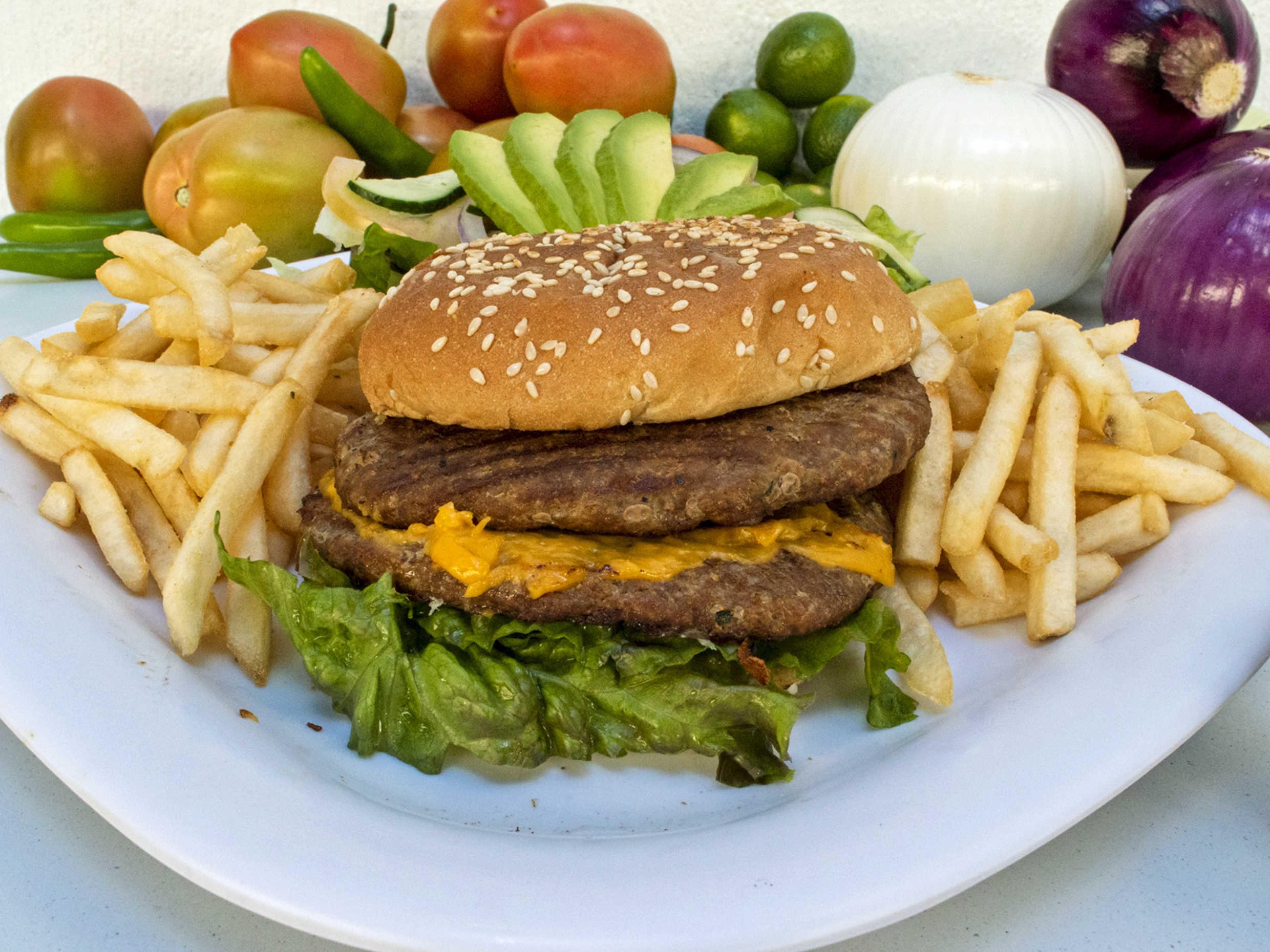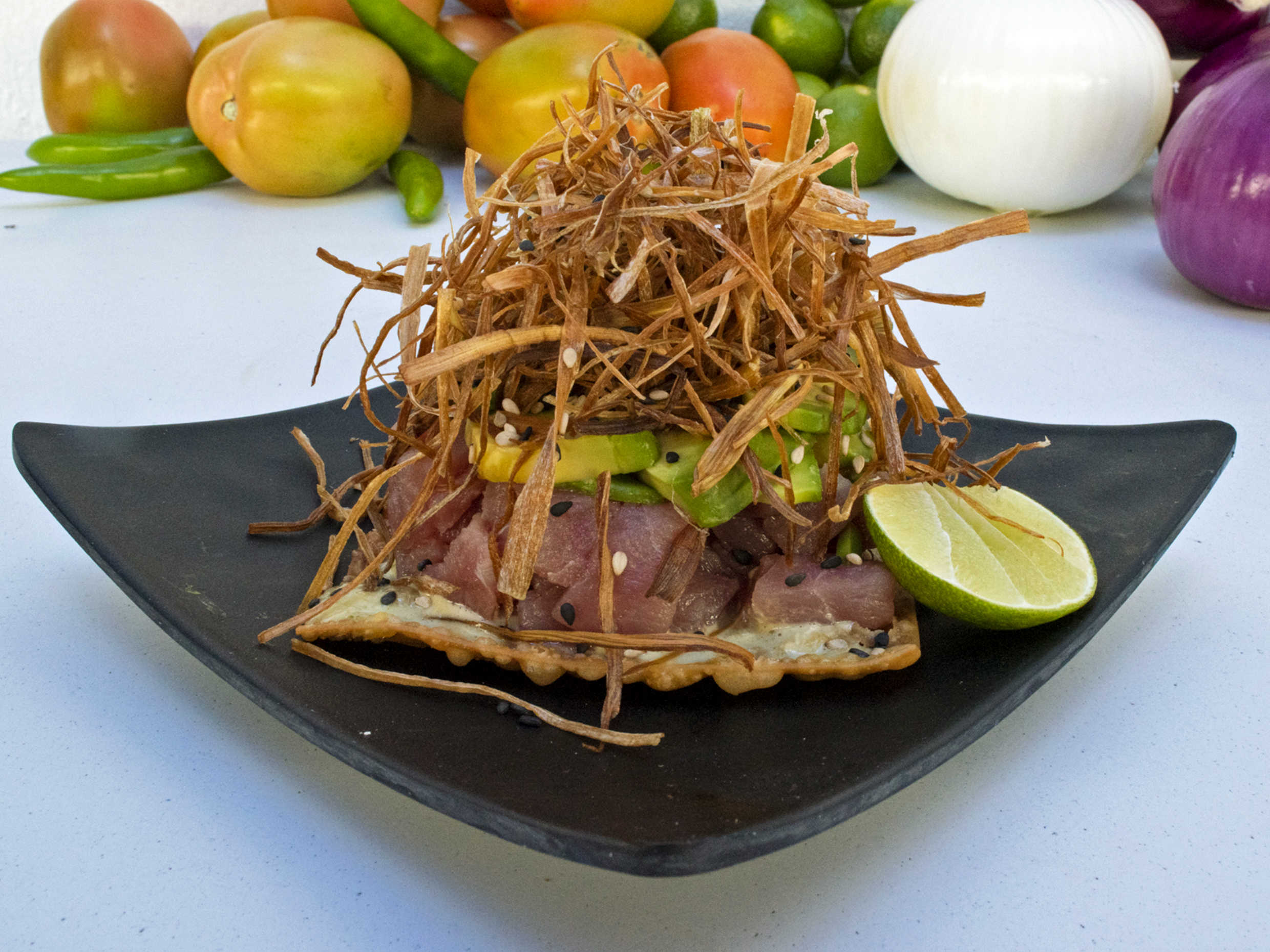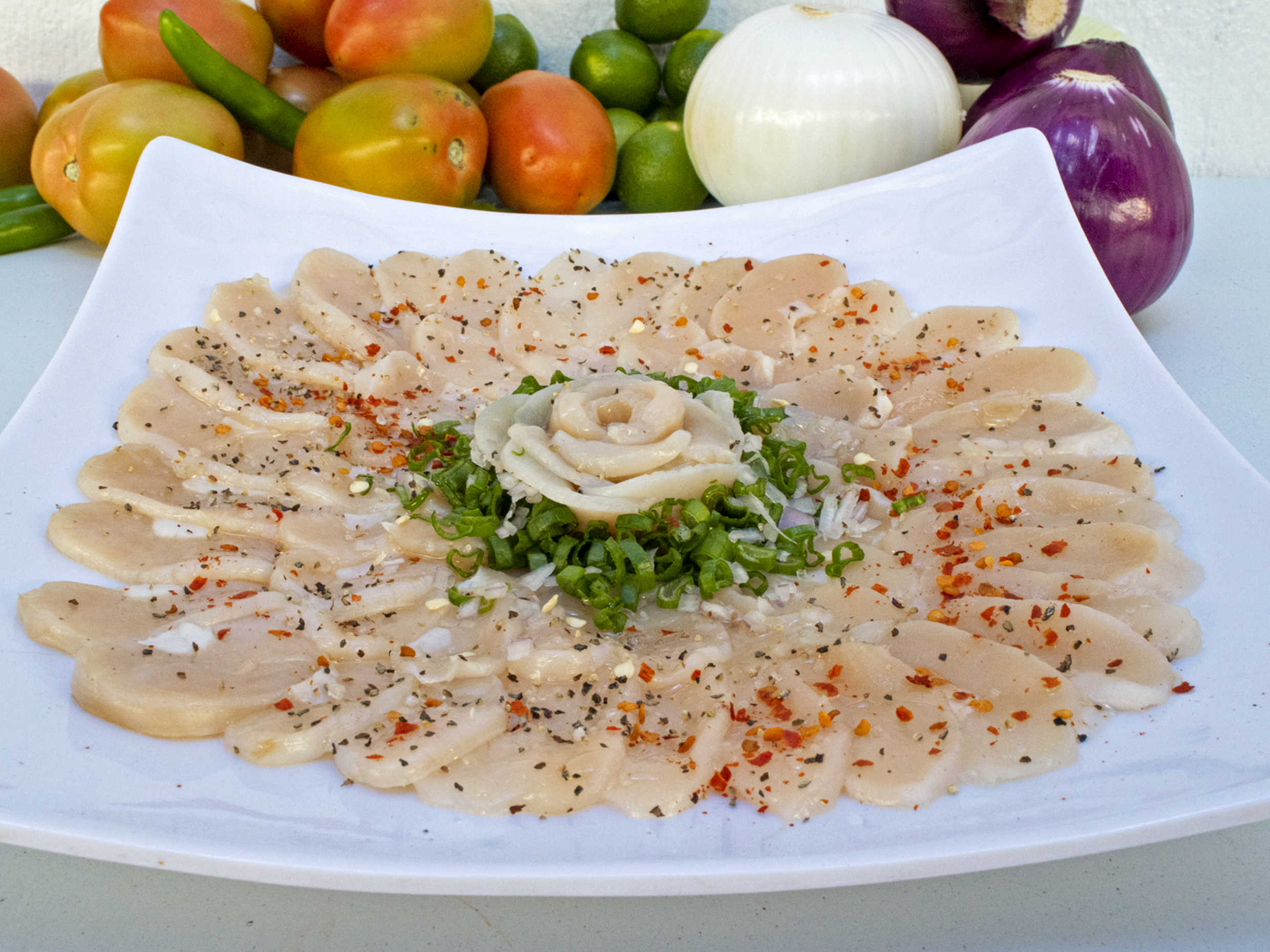 Servida en cama de mayonesa,jitomate,cebolla,pepino,cilantro y aguacate