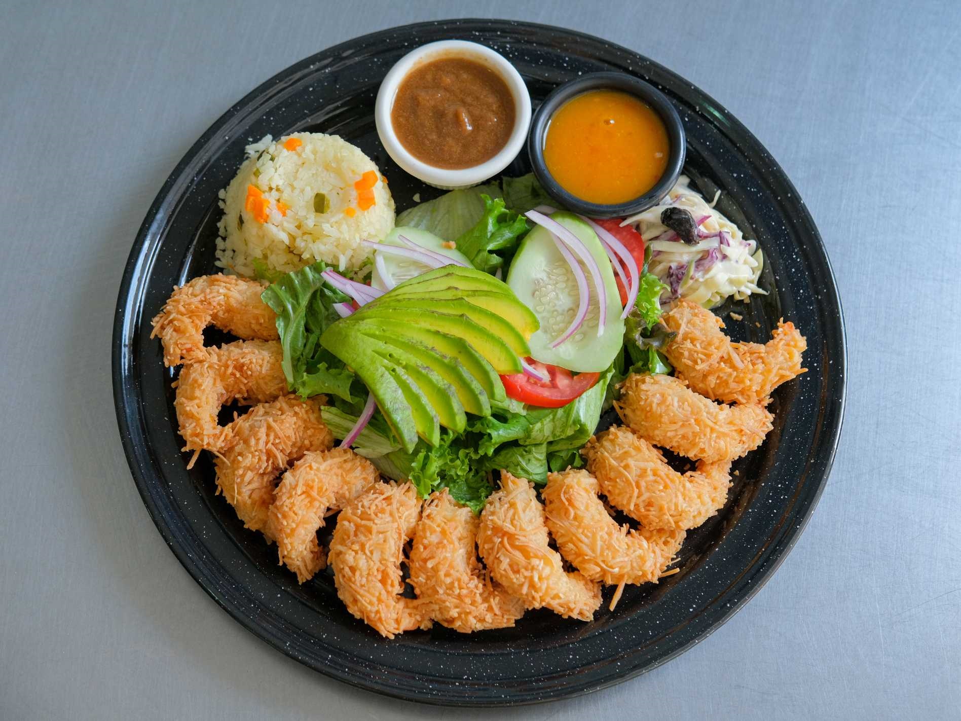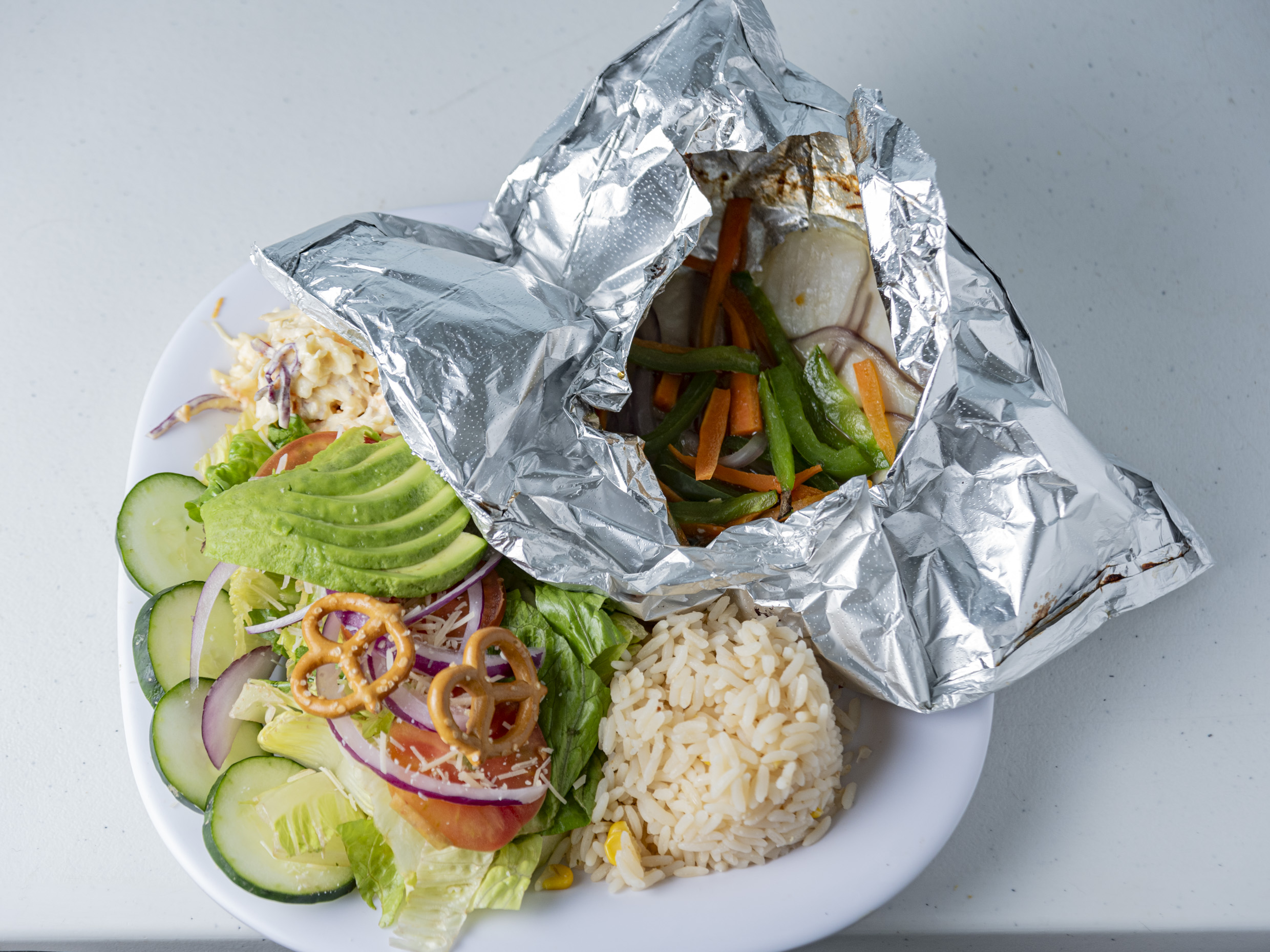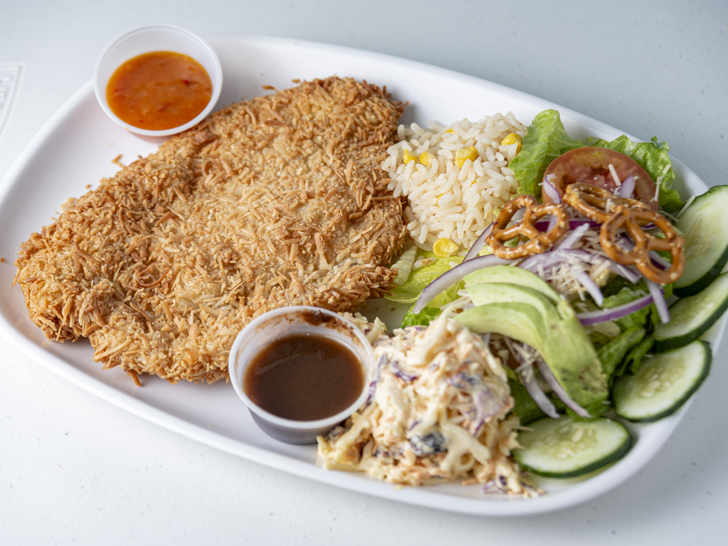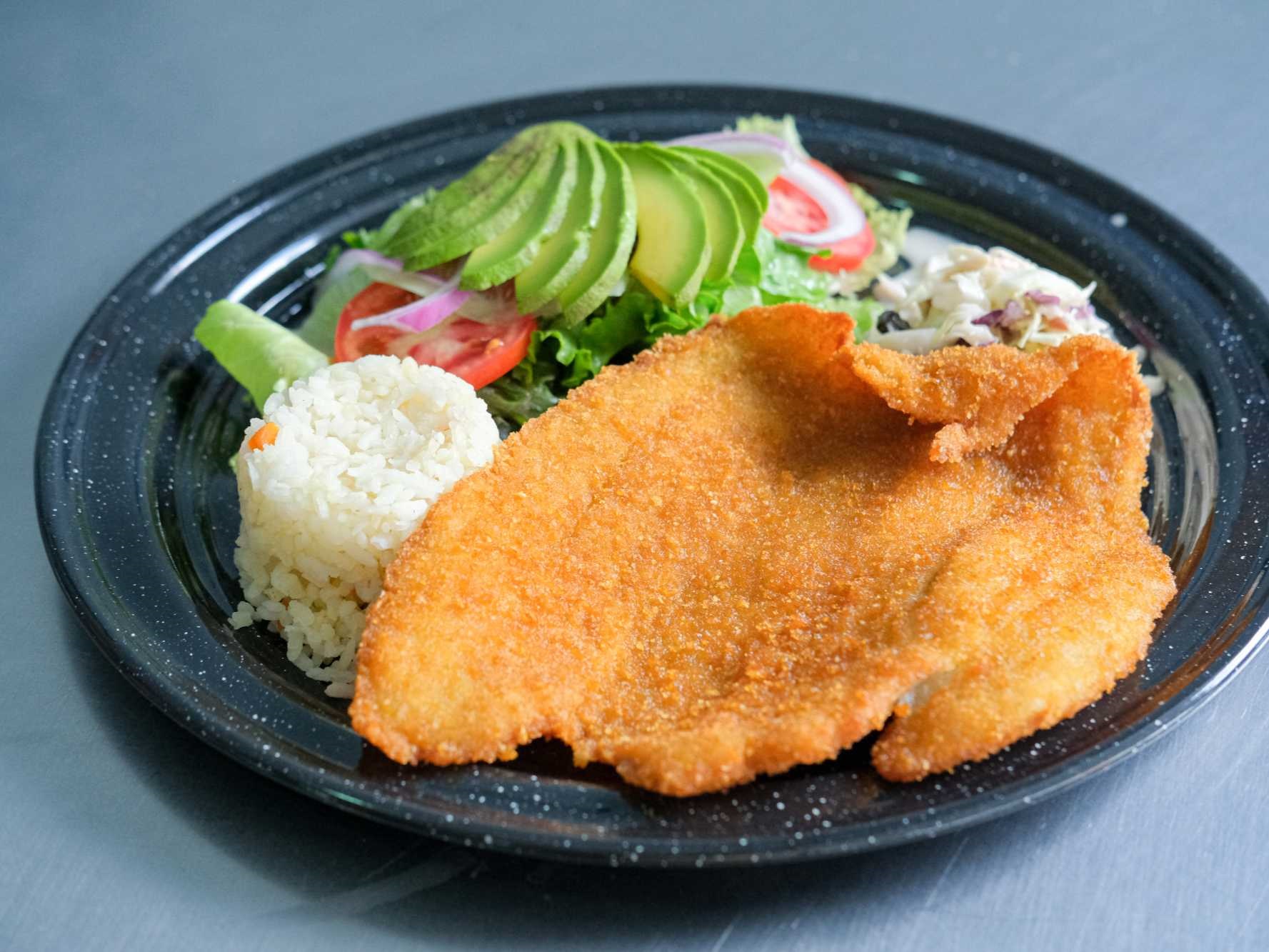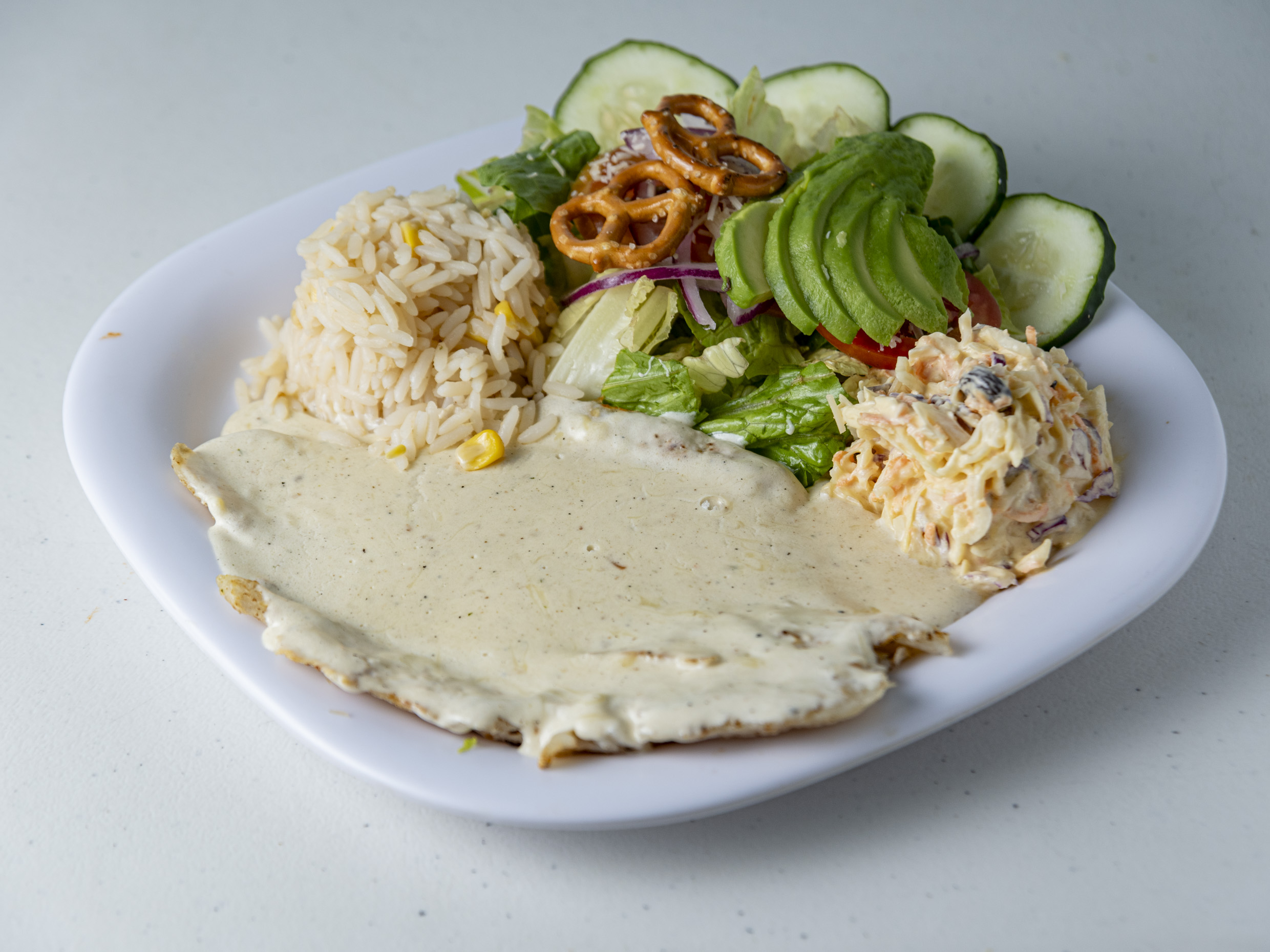 Acompañado de ensalada fresca, ensalada dulce y arroz blanco